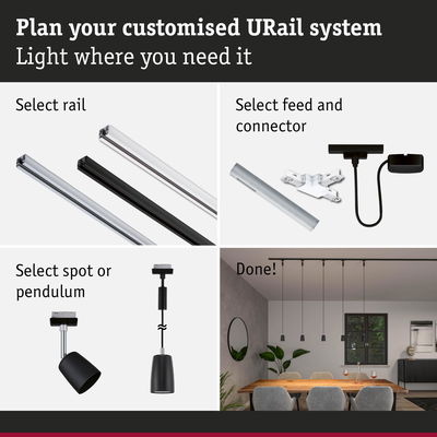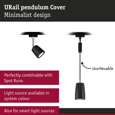 The Cover URail pendant in Black matt is ideal for displays of multiple lamps above dining tables or as an individual highlight above counters and side tables. There are no limits to creativity. Users can choose their lamp according to individual preferences and requirements. Choosing a smart lamp provides the option of convenient control via app. With a total length of 1.50 metres (including shade and URail base), this pendant is not only eye-catching, but also extremely practical to use. The rooms are bathed in a pleasant light and a unique atmosphere is created. If necessary, the URail pendant can be shortened. Detailed step-by-step instructions can be found in the FAQs in the Support Centre.