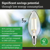 The ultra-efficient Eco-Line lamps combine innovation with sustainability. Thanks to the 60% lower energy consumption and the significantly longer service life compared to standard LED lamps, these lamps can significantly reduce energy costs and protect the environment. The candle-shaped lamps (3-piece set) with 3000K, an output of 3x2.5W and 3x525lm create a pleasantly uniform light with no green cast. Thanks to their slim design, candle lamps are particularly suitable for use in chandeliers, as well as in wall and ceiling luminaires. Their pleasant light creates a feel-good atmosphere in your living space. The lamp fits any standard E14 fitting. With this practical multi-pack, you can install several luminaires at once, and light up an entire room!