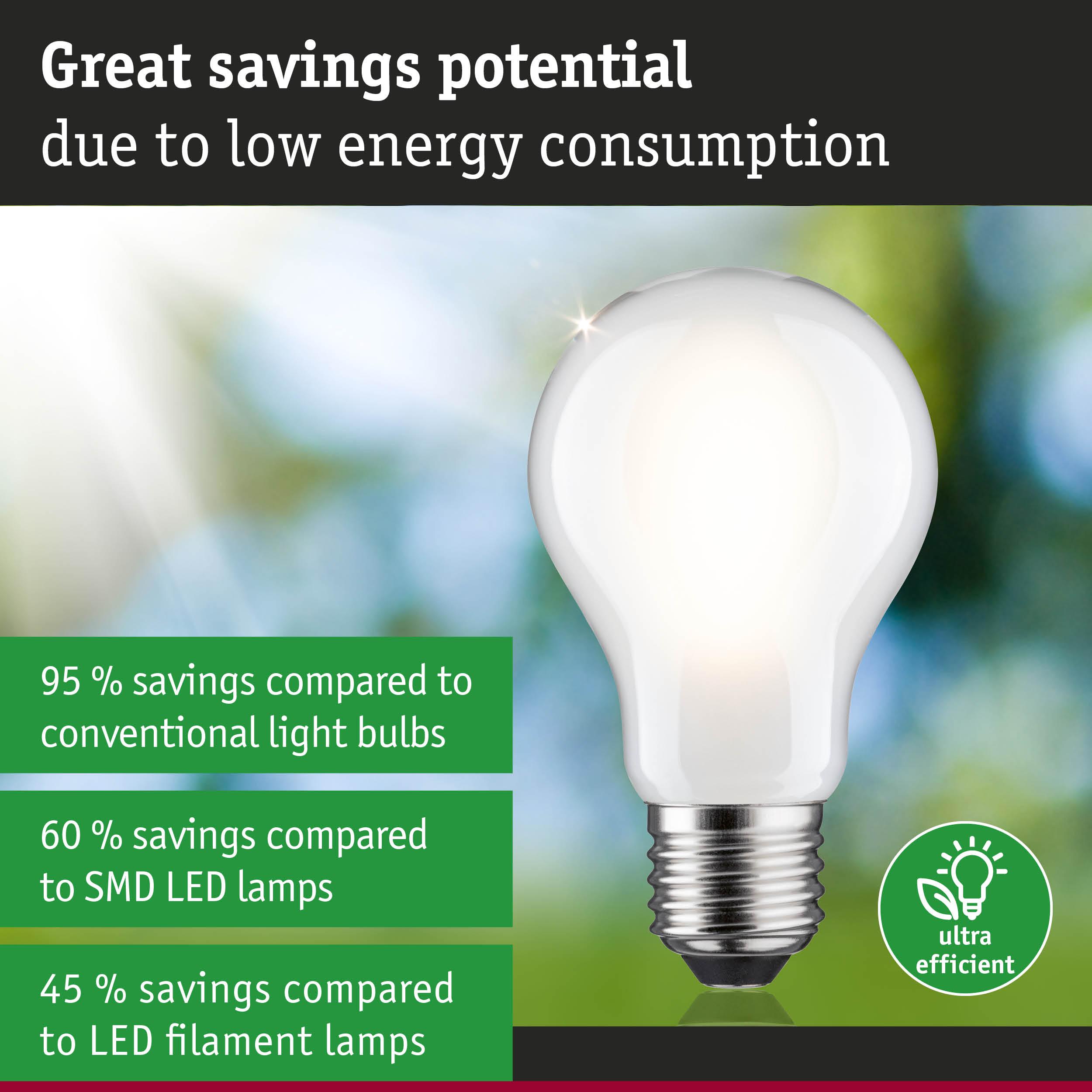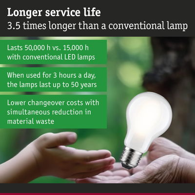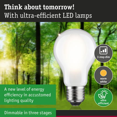 The ultra-efficient LED lamps in the LED Eco-Line combine innovative technology with sustainability and provide efficient and stylish lighting. Thanks to the 60% lower energy consumption and the significantly longer service life compared to standard LED lamps, these lamps can significantly reduce energy costs and protect the environment. The matt filament LED bulb with 3000K and an output of 8,2W fits any standard E27 fitting and emits an attractive warm white light without a green cast. Even large lampshades are illuminated uniformly, transforming every room with a harmonious, cosy ambiance. The brightness of the lamp can be adjusted in three stages using a conventional light switch, according to your individual requirements. The dimmer has a memory function. All Paulmann LED lamps with the “Eye Friendly” label emit gentle-on-the-eye and attractive light. For working, reading or relaxing, the lamps contribute to optimum visual comfort.
