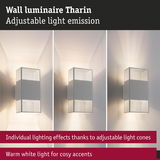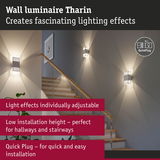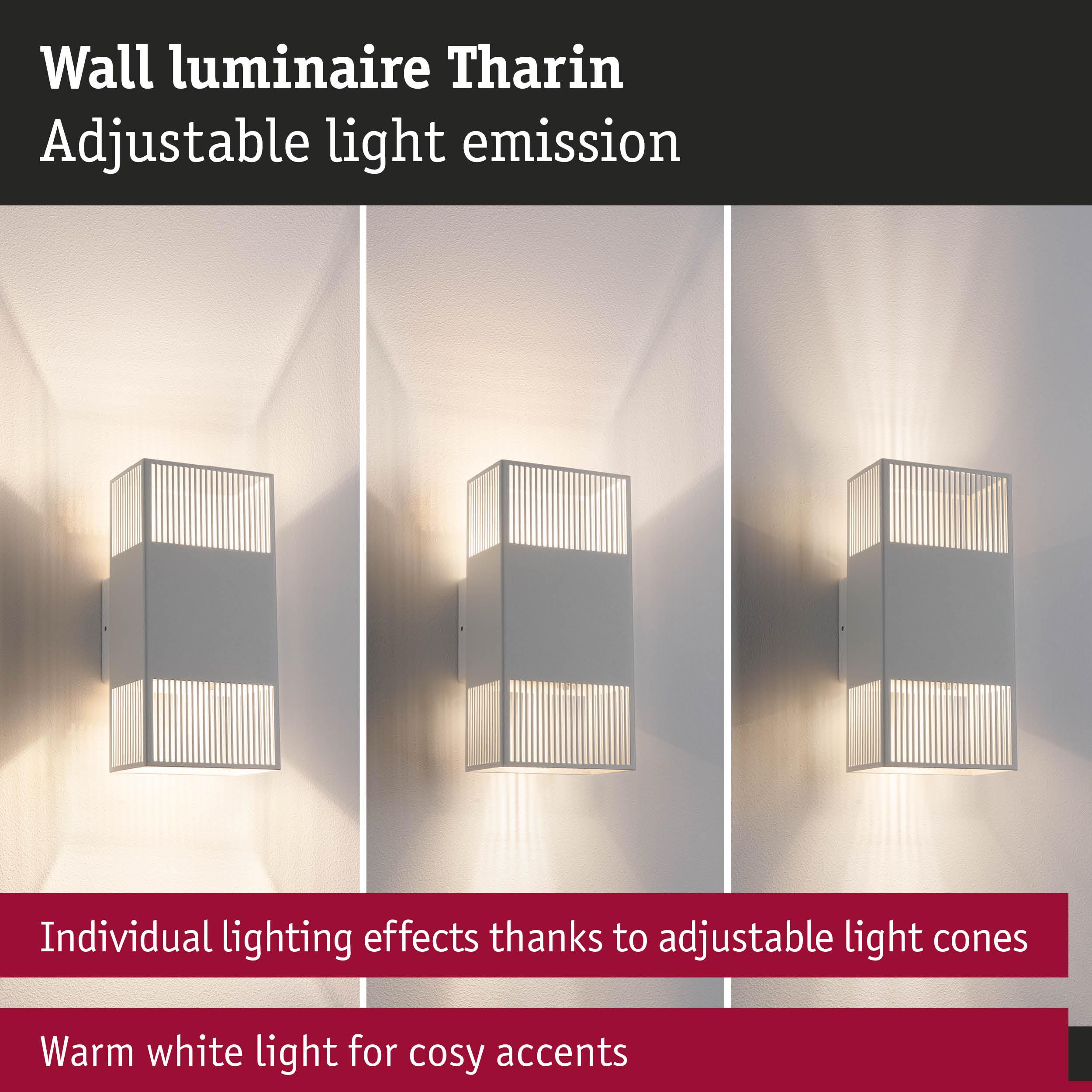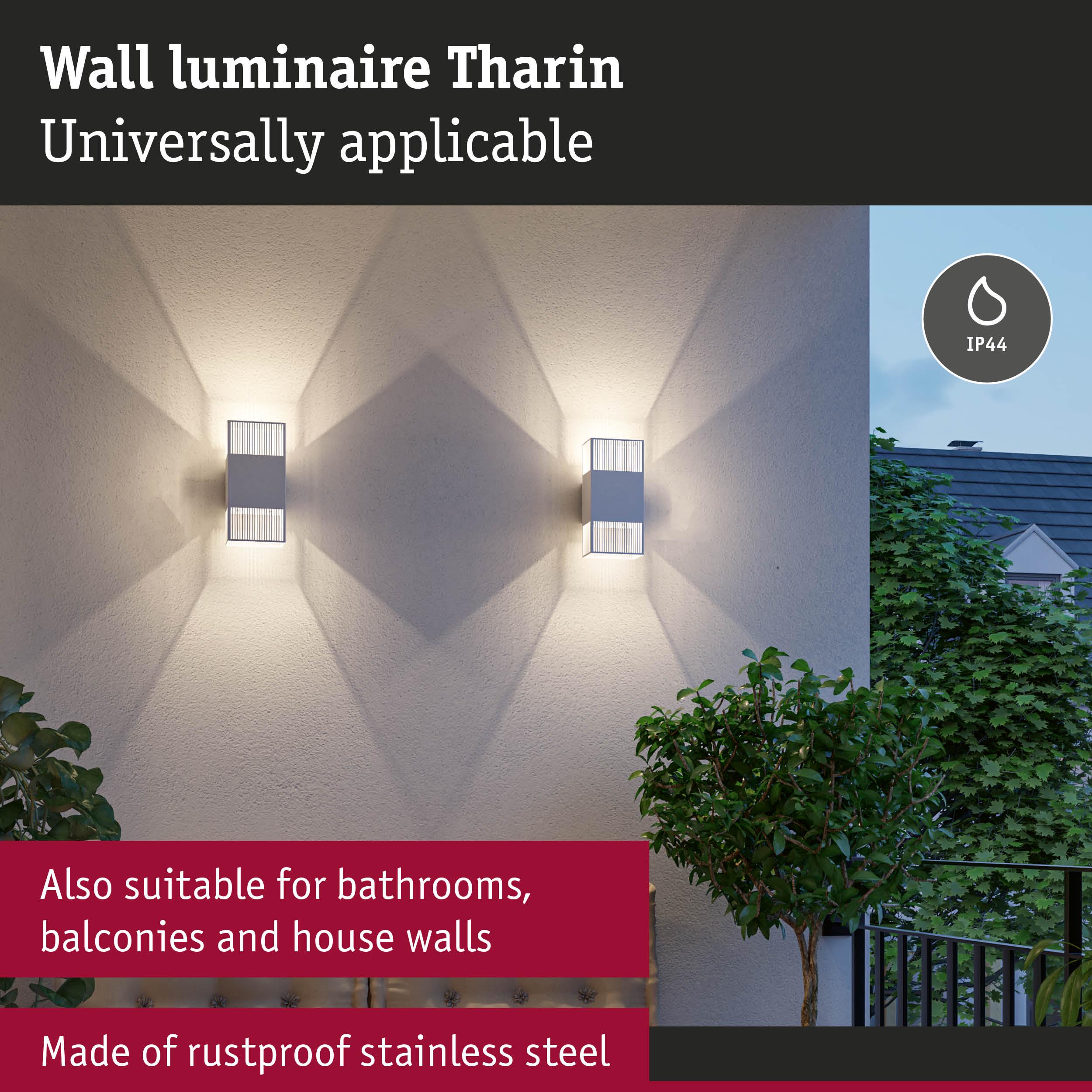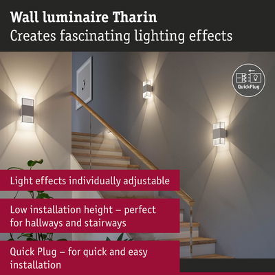 With its fascinating light effect created by the cut-outs of lines, the Tharin wall luminaire in the colour White is a real eye-catcher indoors and outdoors. It is equipped with 2x3.7W fixed LED light sources and, thanks to its low installation depth, is particularly suitable for lighting corridors and stairways. Thanks to its IP44 protection and the use of high-quality rustproof stainless steel, the Tharin wall luminaire can be installed not only in all indoor areas, but also in bathrooms, on balconies and on house walls. The independently adjustable light beams upwards and downwards allow individual lighting effects that give any environment an impressive atmosphere. The wall luminaire provides cosy lighting with a colour temperature of 3000K. High-quality components guarantee a long lifetime of at least 30,000 hours. The innovative QuickPlug mounting plug enables time-saving installation thanks to a simple plug-in system.