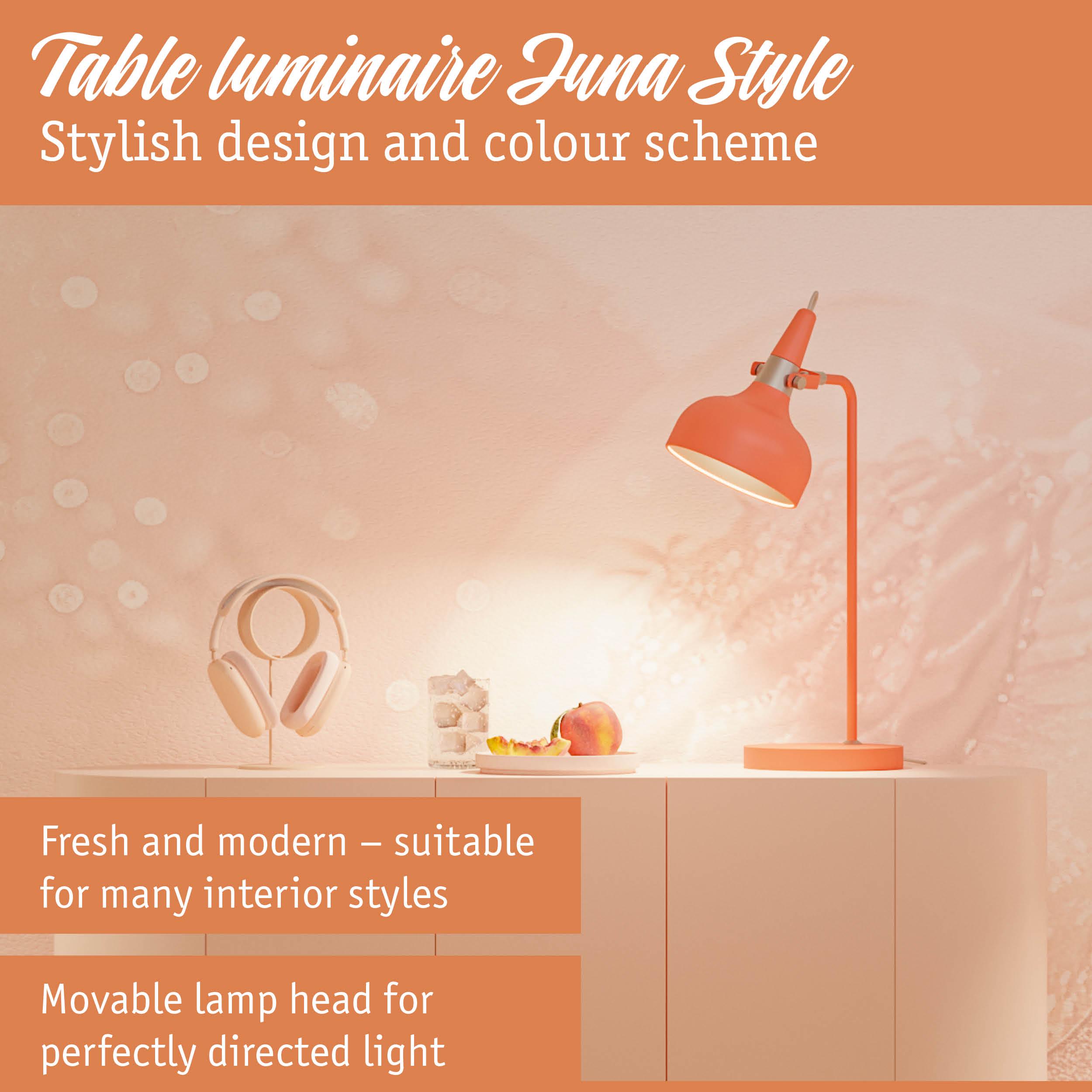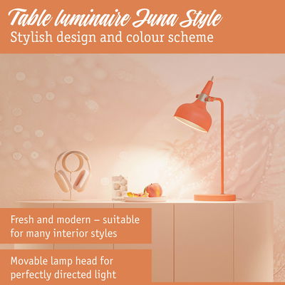 With their modern form and design language, the Juna Style luminaires create attractive lighting accents in the living area. The coordinated table, floor and pendant luminaires in the series can be harmoniously combined with each other as desired. Whether on the bedside table, as a desk luminaire or as a decorative design element on the sideboard - in its colorful peach, the table luminaire is a real eye-catcher. Its high-quality workmanship not only ensures an appealing look, but also a long lifetime. The movable lamp head allows the light to be directed flexibly, while the textile cable with cable switch ensures convenient and safe use. Decorative head mirror lamps with an E14 base, which provide glare-free light, are particularly suitable as a recommended light source.