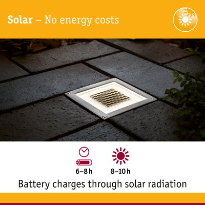 This technically flawless product shows no signs of use and is only being offered at a significantly reduced price due to defects in the original packaging. This solar floor recessed luminaire can provide you with light anywhere in the garden – without having to install any cables. Solar cells enable the floor recessed luminaires to operate completely without electricity. Replaceable rechargeable batteries are charged by sunlight during the day and the LEDs light up when evening sets in. Thanks to its IP67 protection type, the floor recessed luminaire is guaranteed waterproof, stainless and suited for installation in walkable outdoor areas – the luminaire can easily withstand up to 500 kg in weight.