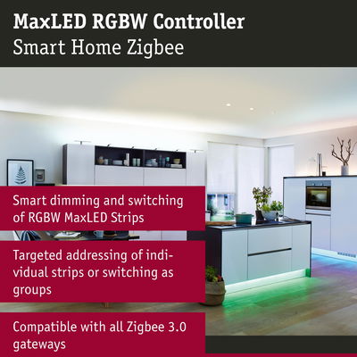 With the MaxLED RGBW controller from the Smart Home Zigbee 3.0 series, MaxLED strips with RGBW coloured light control can be switched and dimmed. The controller is Zigbee 3.0-compatible. Zigbee 3.0 is a radio transmission protocol which links up the devices of several manufacturers. This allows not only the centralised control of lighting; shutters, heating and alarm systems, for example, can also be integrated. To operate the control, you can choose between the Smart Friends Box, a gateway for the same standard by a different manufacturer, or a Smart Home Zigbee 3.0 hand-held transmitter. Specific individual components can be addressed, or switched in groups as lighting scenarios.