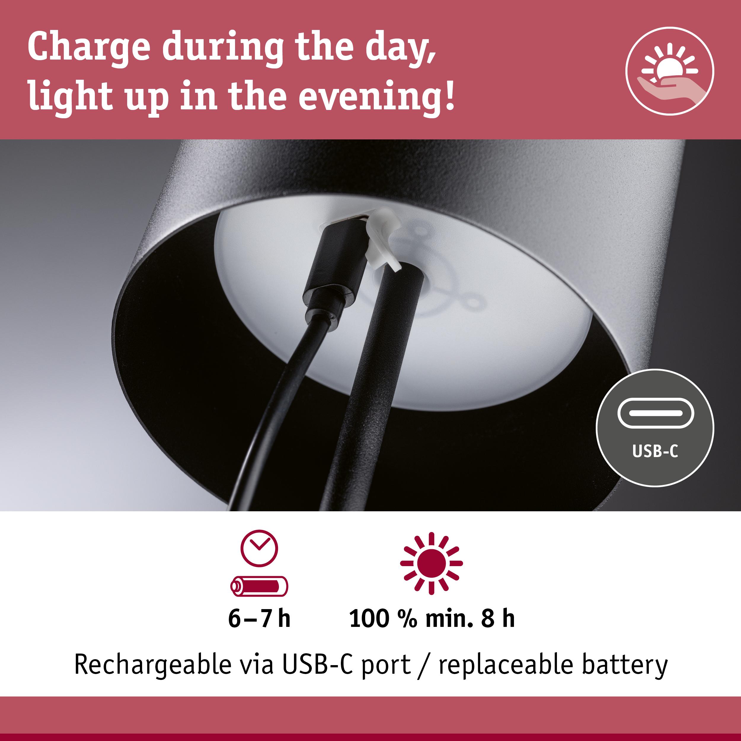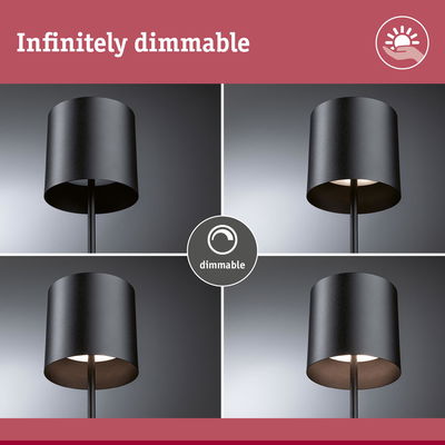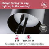 The portable battery-powered LED table luminaire Tuni with IP44 in Black matt is handy and compact, thanks to its dimensions of 105 x 350 mm. It does not need a power connection, allowing it to be used both indoors and outdoors. Whether it’s out camping, on the patio or balcony, in a restaurant or the living room – the battery-powered table luminaire can be used anywhere. Its reduced, timeless design makes it universal and flexible. The luminaire creates a warm white lighting mood and features a high-quality finish and durable materials, ensuring a long service life. The fast charging time of 5–6 hours provides a long illumination time of up to 10 hours at full brightness (100%). The battery-powered table luminaire can be charged via the USB-C connection and features a continuous touch dimming function.