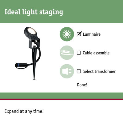 The Plug & Shine String ground spike, with a beam angle of 100 degrees and warm white light, is ideal for illuminating plants or objects. It can be positioned as needed and is fully weatherproof. With transformers, connectors and additional luminaires from the Plug & Shine series, you can compile an individual lighting installation for your outdoor spaces.