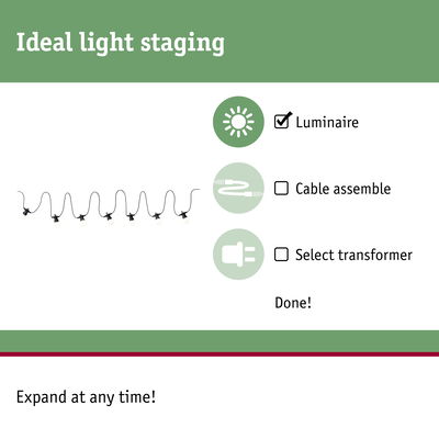 The Plug & Shine light chain with warm white light creates the perfect atmosphere outdoors and can be flexibly wound around railings, furniture and plants. With transformers, connectors and additional luminaires from the Plug & Shine series, you can compile an individual lighting installation for your outdoor spaces.