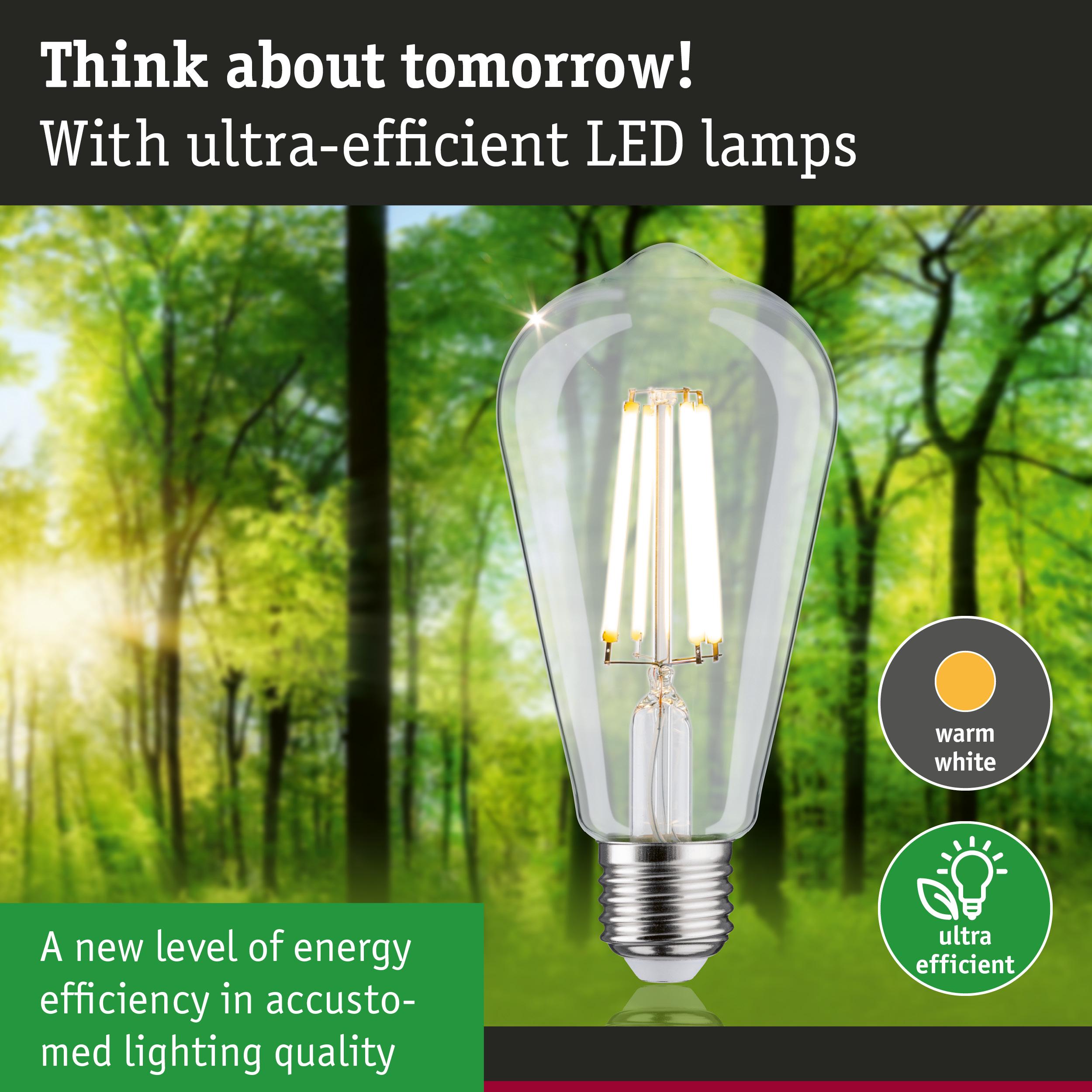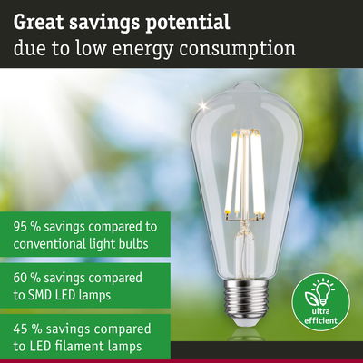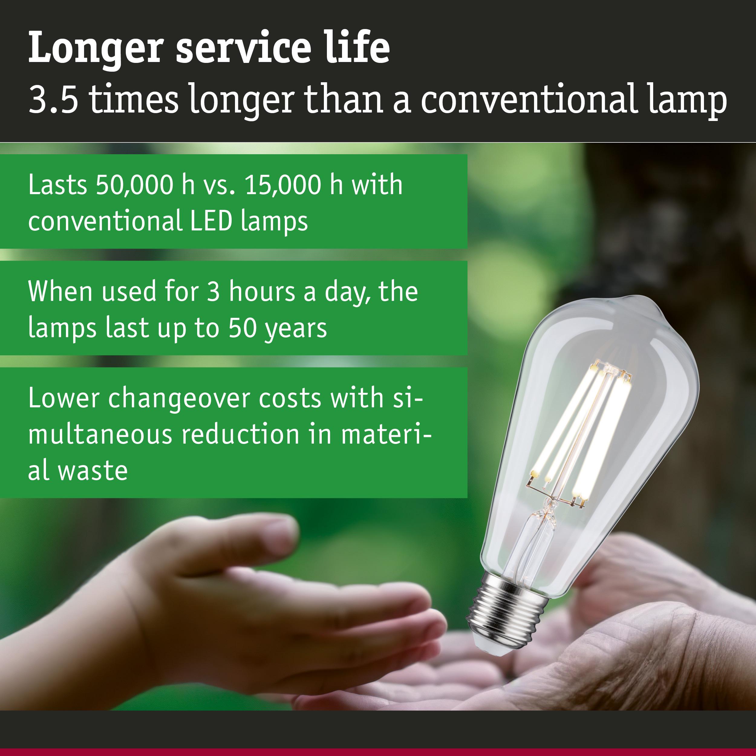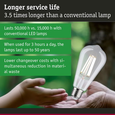 The ultra-efficient Eco-Line lamps combine innovation with sustainability. Thanks to the 60% lower energy consumption and the significantly longer service life compared to standard LED lamps, these lamps can significantly reduce energy costs and protect the environment. The clear filament corn lamp with 4000K, an output of 4W and 840lm emits light in all directions with no green cast. Corn lamps are perfect for creating a vintage ambiance and are real eye-catchers in retro style pendant luminaires. It has a neutral white light colour and fits any commercial E27 socket. The Paulmann LED lamps with the Eye friendly label emit gentle-on-the-eyes, comfortable light. Luminaires help create eye comfort – while working, reading, or relaxing.