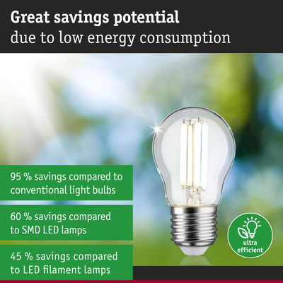 The ultra-efficient LED lamps in the Eco-Line combine innovative technology with sustainability and provide efficient and stylish lighting. Thanks to the 60% lower energy consumption and the significantly longer service life compared to standard LED lamps, these lamps can significantly reduce energy costs and protect the environment. The clear filament drop-shaped lamp with 4000K and an output of 2.5 W and 525 lm fits any standard E27 fitting and emits a neutral white light without a green cast. Thanks to their compact design, drop-shaped lamps are ideal for use in small luminaires. All Paulmann LED lamps with the “Eye Friendly” label emit gentle-on-the-eye and attractive light. For working, reading or relaxing, the lamps contribute to optimum visual comfort.