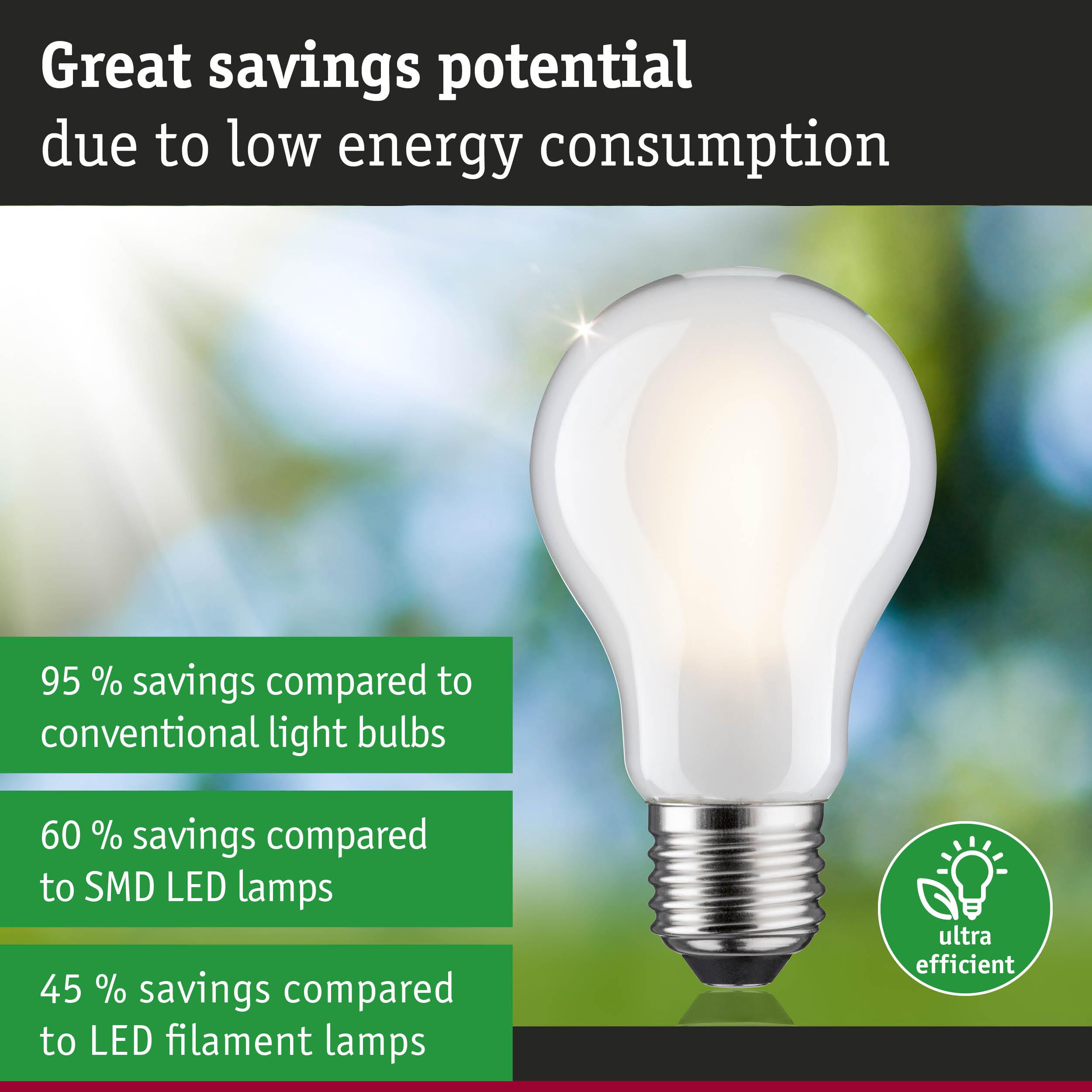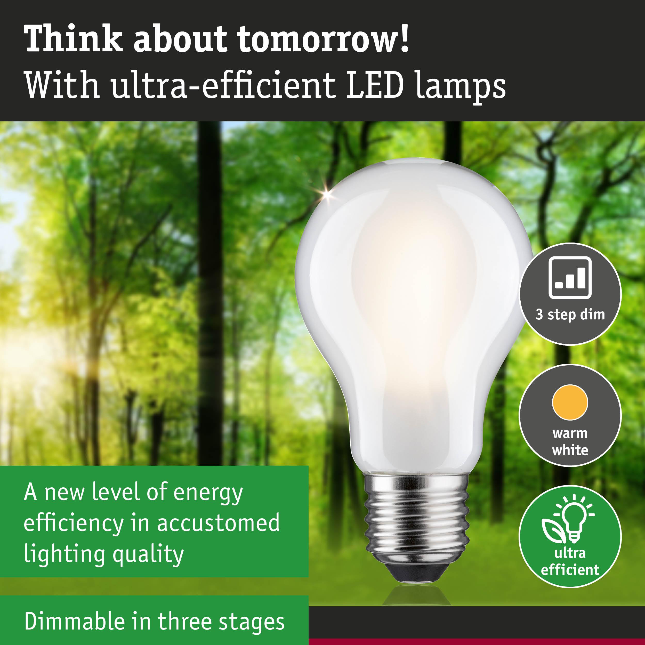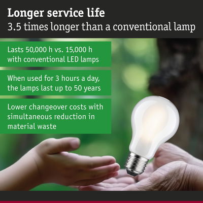 The ultra-efficient LED lamps in the LED Eco-Line combine innovative technology with sustainability and provide efficient and stylish lighting. Thanks to the 60% lower energy consumption and the significantly longer service life compared to standard LED lamps, these lamps can significantly reduce energy costs and protect the environment. The matt filament LED bulb with 3000K and an output of 2,5W fits any standard E27 fitting and emits an attractive warm white light without a green cast. Even large lampshades are illuminated uniformly, transforming every room with a harmonious, cosy ambiance. The brightness of the lamp can be adjusted in three stages using a conventional light switch, according to your individual requirements. The dimmer has a memory function. All Paulmann LED lamps with the “Eye Friendly” label emit gentle-on-the-eye and attractive light. For working, reading or relaxing, the lamps contribute to optimum visual comfort.