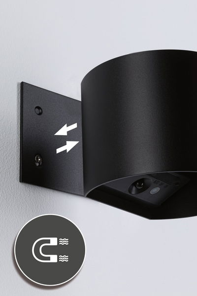 The round rechargeable Nyora wall luminaire in Black with integrated motion sensor is a perfect choice where a functional auxiliary or orientation light is needed. As there is no need for a power outlet, it can be used in the living room, hallway, and – thanks to its IP44 protection – even in the bathroom, on the balcony, or on an external wall. The luminaire offers three setting options: On, Off, and Auto. Switched on, the luminaire continuously emits warm white light at 40% brightness. In Auto mode, the dusk-controlled motion sensor is activated, and the light automatically switches to 100% brightness for maximum comfort and security. Light time in Auto mode is at around 8 hours, and 23 hours in On mode. The luminaire deactivates after 30 seconds if no motion is detected or ambient brightness surpasses 30 lux. The included USB-C charging cable guarantees quick charging times of the rechargeable battery in 6 hours. As an installation aid, the magnetic backplate can be glued or bolted to the wall. It ensures that the luminaire is quickly and easily removed for charging.