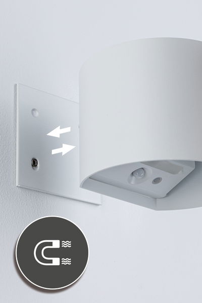 The round rechargeable Nyora wall luminaire in White with integrated motion sensor is a perfect choice where a functional auxiliary or orientation light is needed. As there is no need for a power outlet, it can be used in the living room, hallway, and – thanks to its IP44 protection – even in the bathroom, on the balcony, or on an external wall. The luminaire offers three setting options: On, Off, and Auto. Switched on, the luminaire continuously emits warm white light at 40% brightness. In Auto mode, the dusk-controlled motion sensor is activated, and the light automatically switches to 100% brightness for maximum comfort and security. Light time in Auto mode is at around 8 hours, and 23 hours in On mode. The luminaire deactivates after 30 seconds if no motion is detected or ambient brightness surpasses 30 lux. The included USB-C charging cable guarantees quick charging times of the rechargeable battery in 6 hours. As an installation aid, the magnetic backplate can be glued or bolted to the wall. It ensures that the luminaire is quickly and easily removed for charging.