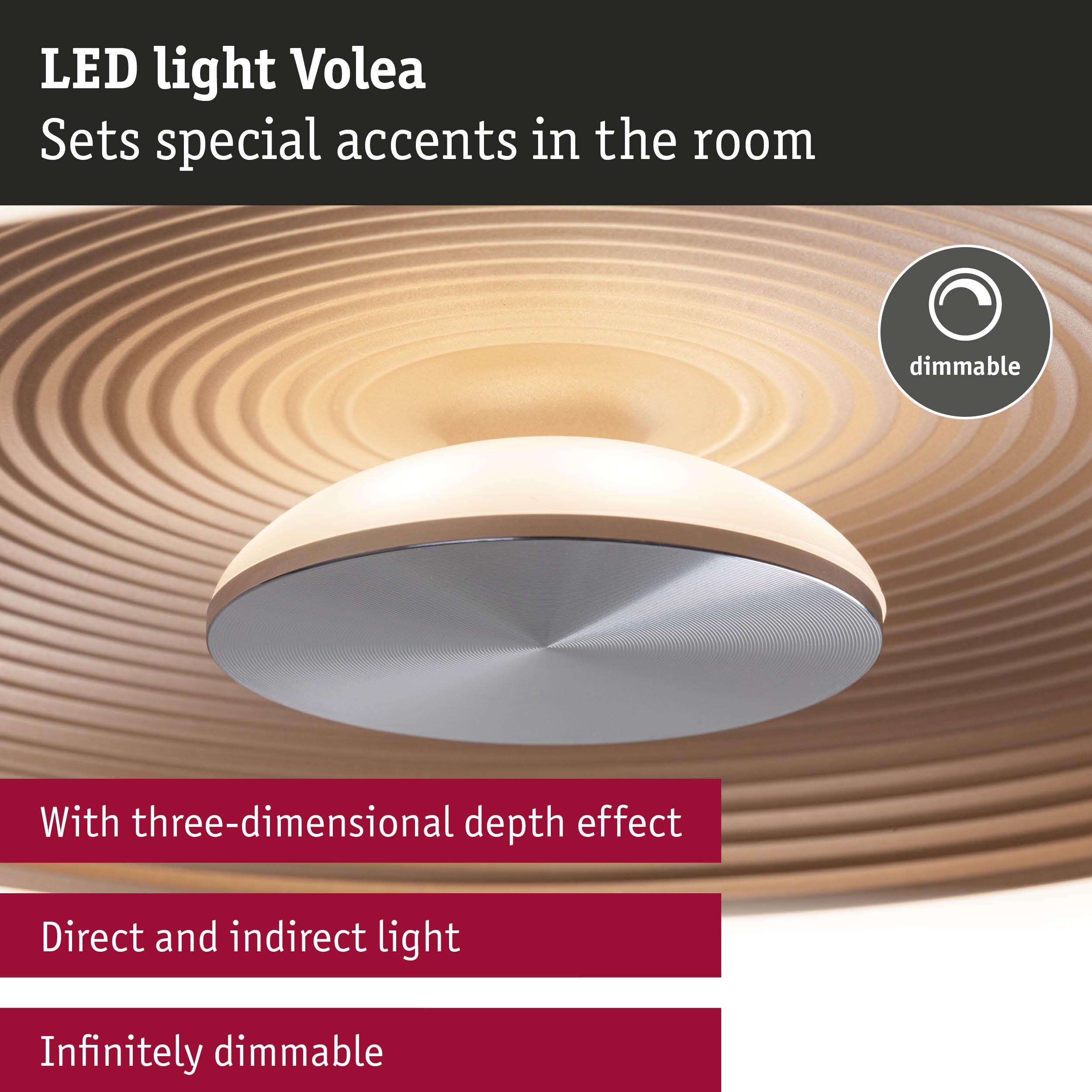 The Volea wall and ceiling luminaire in Black/Gold/Silver, with a diameter of 320mm, is available in a practical value pack with the colour-coordinating pendant suspension. It features a unique combination of direct and indirect light emission, and the look of resulting illumination is reinforced by the 3D depth effect created by the circle inset inside the luminaire body, giving its surroundings an inviting and atmospheric ambience. The warm white colour temperature (3000K) promotes comfort and well-being in the living room, bedroom, and even the bathroom, as it has IP44 protection. The light of the luminaire is steplessly dimmable, allowing users to set the exact brightness they want. The matching pendant suspension is included in delivery, allowing the Volea ceiling luminaire to be suspended by up to 150 cm from the ceiling. As a result, the light can be positioned over the dining table or kitchen counter as needed, providing additional flexibility. Thanks to plenty of room in the connection housing, simple plug-in connections and twist locks, installation is easy and straightforward.