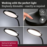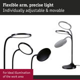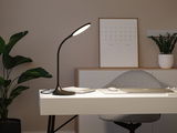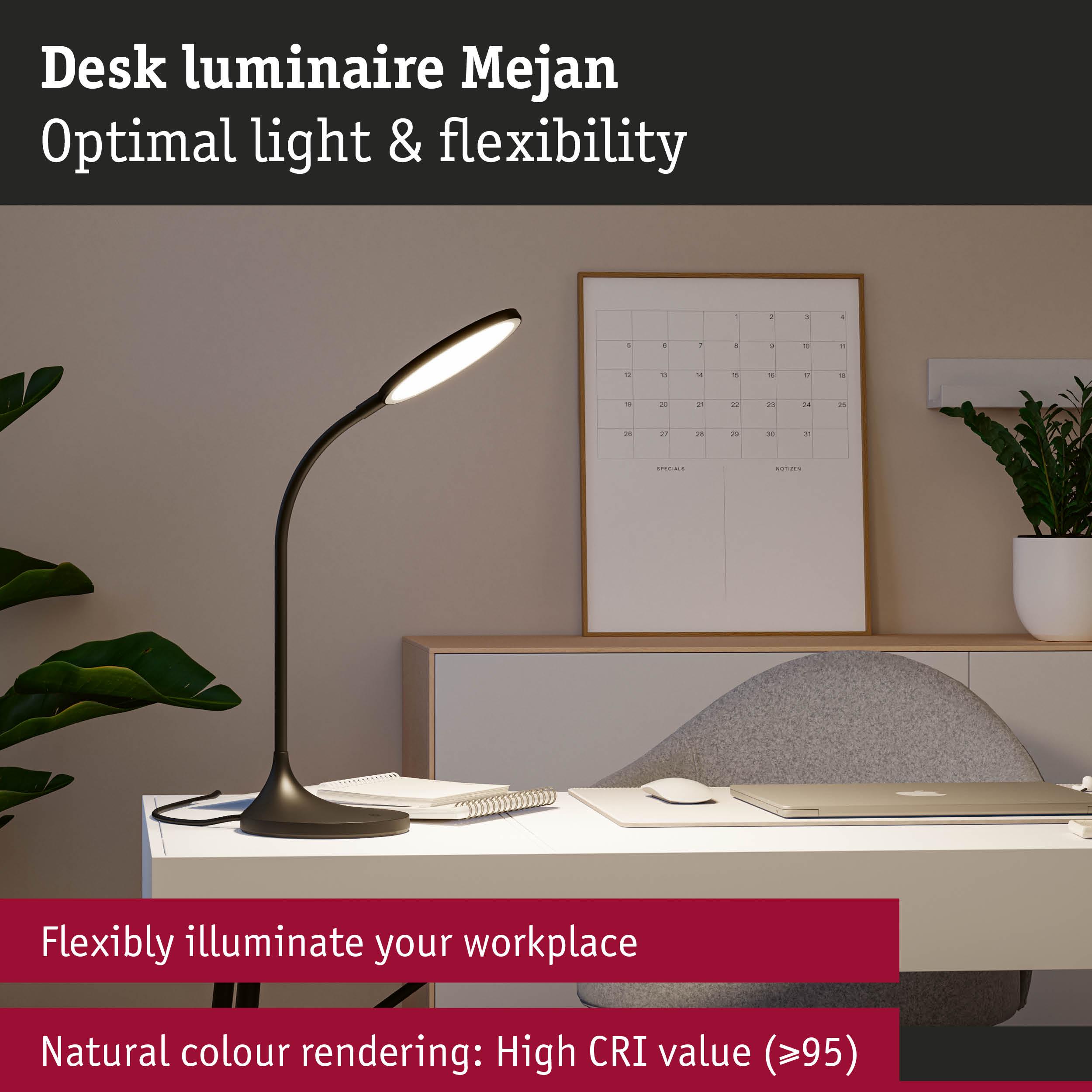 The Mejan desk luminaire in Black matt features a flexible swan neck for maximal adjustability. It illuminates work areas and is steplessly adjustable in its luminous intensity to suit individual requirements. Its 15W output and 4000K colour temperature ensures neutral white, glare-free light – perfect for a focused work environment. The light colour feels particularly natural due to its high colour rendering index of 90+. The combination of modern design and excellent functionality ensures a productive ambience in the home office. This desk luminaire is a great choice for anyone wanting to optimally illuminate their workspace, while adding an aesthetic design element. The scope of delivery includes the luminaire and a practical 1.50 m cable.