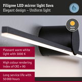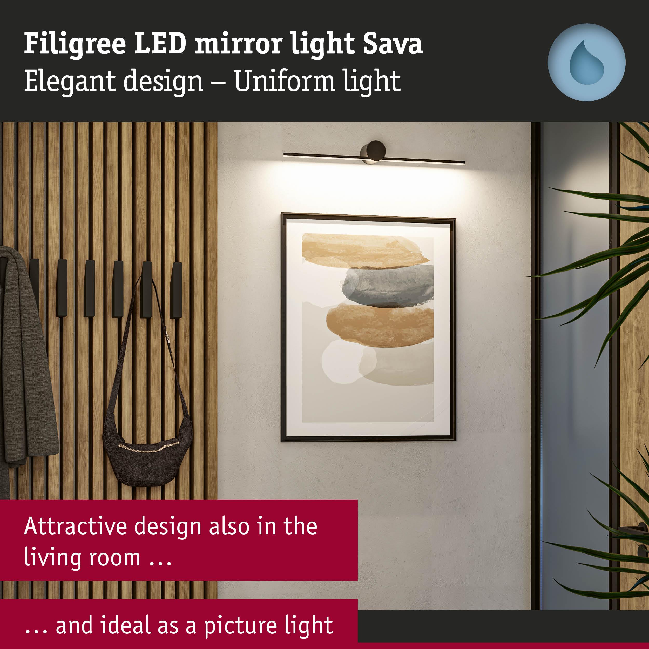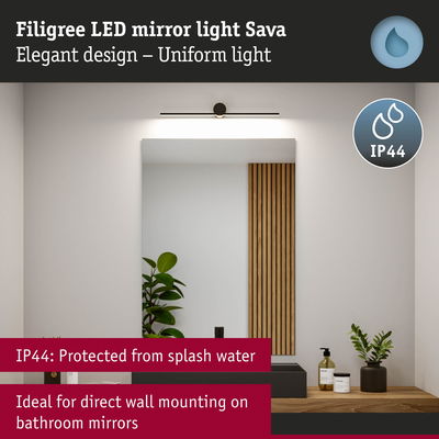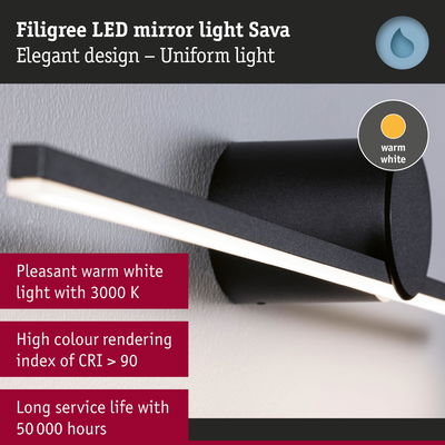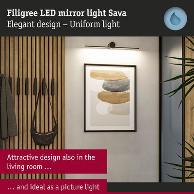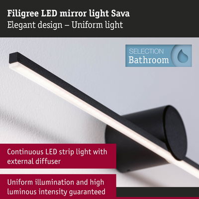 The Sava mirror tube luminaire in Black matt is not only functional, but also the perfect visual highlight with its sleek, modern look. Thanks to the high IP protection of IP 44, the luminaire is protected against splashing water and is particularly suitable for bathrooms or other damp rooms. It impresses not only with its simple elegance, but also with its versatility: Whether in the bathroom, in the hallway or as a stylish picture luminaire – it blends harmoniously into any environment. The satined, continuous LED strip light with external diffuser provides pleasant, glare-free light distribution with 3000K and perfectly illuminates the area around the mirror. With a width of just 600x72mm, it can be perfectly adapted to narrow mirror or picture sizes. Thanks to its long service life of up to 50,000 hours and the high-quality finish in metal and acrylic, it features particularly high quality. The high colour rendering is particularly impressive in the mirror area.