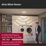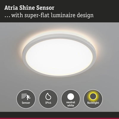 With an output of 16W, the round Atria Shine LED panel luminaire in White and 293mm is a perfect choice for basic lighting in utility rooms, storage rooms, pantries, and connecting rooms. IP44 protection makes the panel luminaire also a good candidate for bathrooms or guest toilets. The integrated motion sensor helps save energy in rooms that are not continuously in use, and the luminaire switches off automatically after 30 seconds without any detected movement. The motion sensor is fully automated and requires no additional settings. The neutral white light of the panel creates uniform and wide-area room illumination. Additional backlighting technology creates an interesting lighting effect and makes the panel luminaire appear to float. The quick clip and special twist lock make the ultra-flat panel luminaire with its installation height of just 30 mm very easy to install.