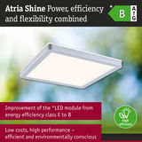 The angular Atria Shine panel luminaire in Chrome matt is a true all-rounder, offering high energy efficiency and a choice of light colours! Its energy efficiency was improved (Class E to Class B), making the new Atria Shine panel luminaire an innovative and future-proof lighting solution. This significantly reduced consumption is not only good for the environment, but for your wallet too, thanks to lower energy costs. At ${Abmessung} and an output of 9.5W, this LED panel luminaire is a great choice for basic lighting in living and bedrooms, in bathrooms, kitchens, or other wet rooms. Before installation, it’s possible to choose between three light colours using the White Select switch: warm white (3000K), neutral white (4000K) or daylight white (6500K). The right light ambience for any space: an inviting living area, functional kitchen lighting, or a brightly lit workspace in the home office. The high-effect backlight technology adds an almost floating aspect to the luminaire’s appearance. Its simple design pairs well with individual interior styles and it can even be used in the bathroom, thanks to IP44 protection. The easy-to-use twist lock and quick clip ensure an uncomplicated installation on the wall or ceiling..