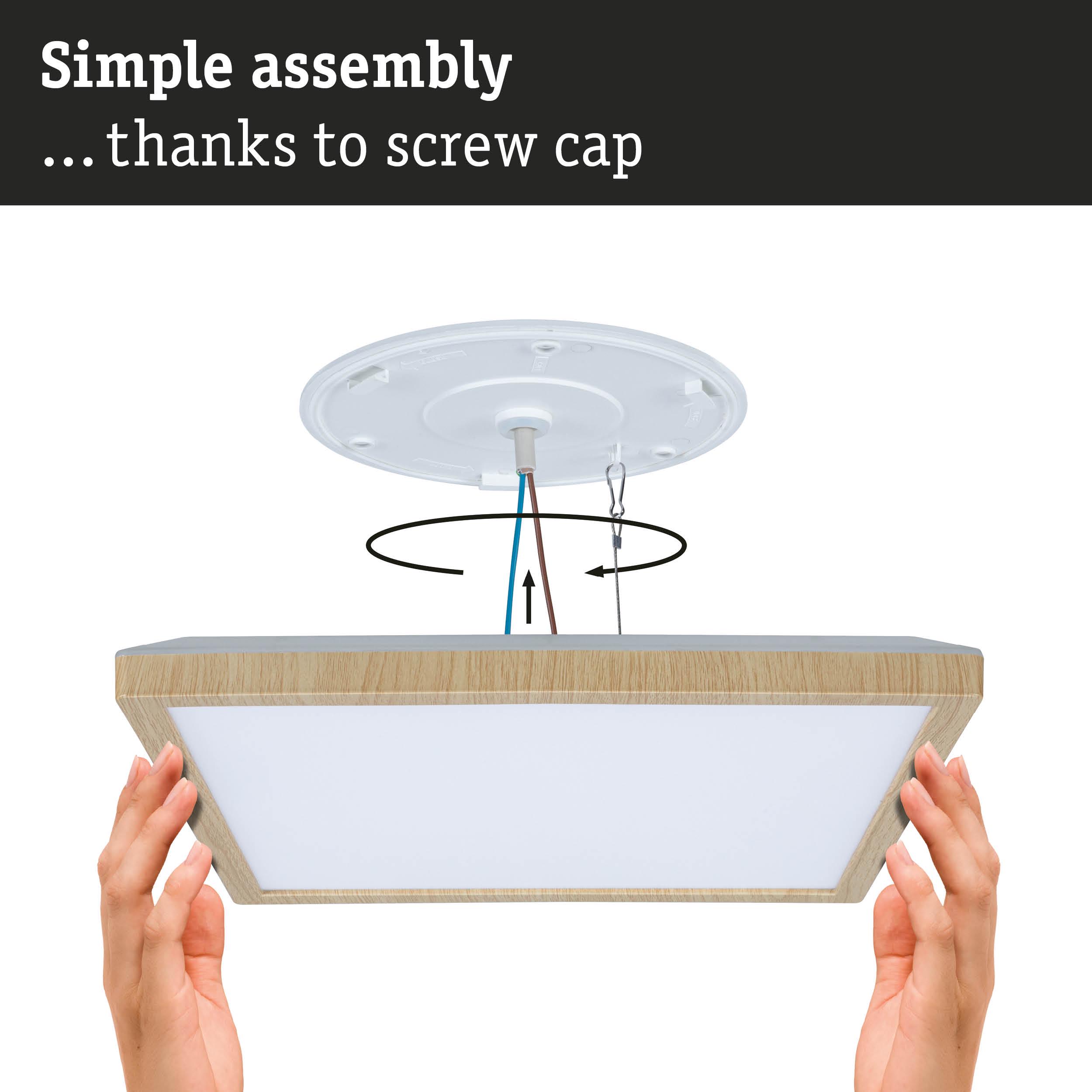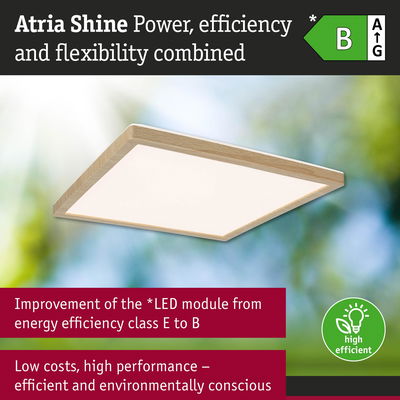 The angular Atria Shine Panel in Wood look is a real all-rounder with its high energy efficiency and variety of lighting options! The panel consumes far less energy than the previous model, boosting its energy efficiency class from E to B. This significantly reduced consumption is not only good for the environment, but for your wallet too, thanks to lower energy costs. Before installation, it’s possible to choose between three light colours using the White Select switch: warm white (3000K), neutral white (4000K) or daylight white (6500K). Whether it’s for a cosy living area, functional kitchen lighting or brightly lit workspace: you can achieve the perfect lighting for every room. With an impressive brightness of up to 15,7W, the Atria Shine Panel is also ideal for demanding applications in which a lot of light is required. Visually, the luminaire stands out for it’s almost floating appearance, made possible by decorative backlight technology. Its simple design pairs well with individual interior styles and it can even be used in the bathroom, thanks to IP44 protection. The luminaire can easily be installed on the wall or ceiling using the simple twist lock and quick clip.