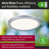The round Atria Shine panel luminaire in Chrome matt is a true all-rounder, offering high energy efficiency and a choice of light colours! Its energy efficiency was improved (Class E to Class B), making the new Atria Shine panel luminaire an innovative and future-proof lighting solution. This significantly reduced consumption is not only good for the environment, but for your wallet too, thanks to lower energy costs. At ${Abmessung} and an output of 9.5W, this LED panel luminaire is a great choice for basic lighting in living and bedrooms, in bathrooms, kitchens, or other wet rooms. Before installation, it’s possible to choose between three light colours using the White Select switch: warm white (3000K), neutral white (4000K) or daylight white (6500K). The right light ambience for any space: an inviting living area, functional kitchen lighting, or a brightly lit workspace in the home office. The high-effect backlight technology adds an almost floating aspect to the luminaire’s appearance. Its simple design pairs well with individual interior styles and it can even be used in the bathroom, thanks to IP44 protection. The easy-to-use twist lock and quick clip ensure an uncomplicated installation on the wall or ceiling..