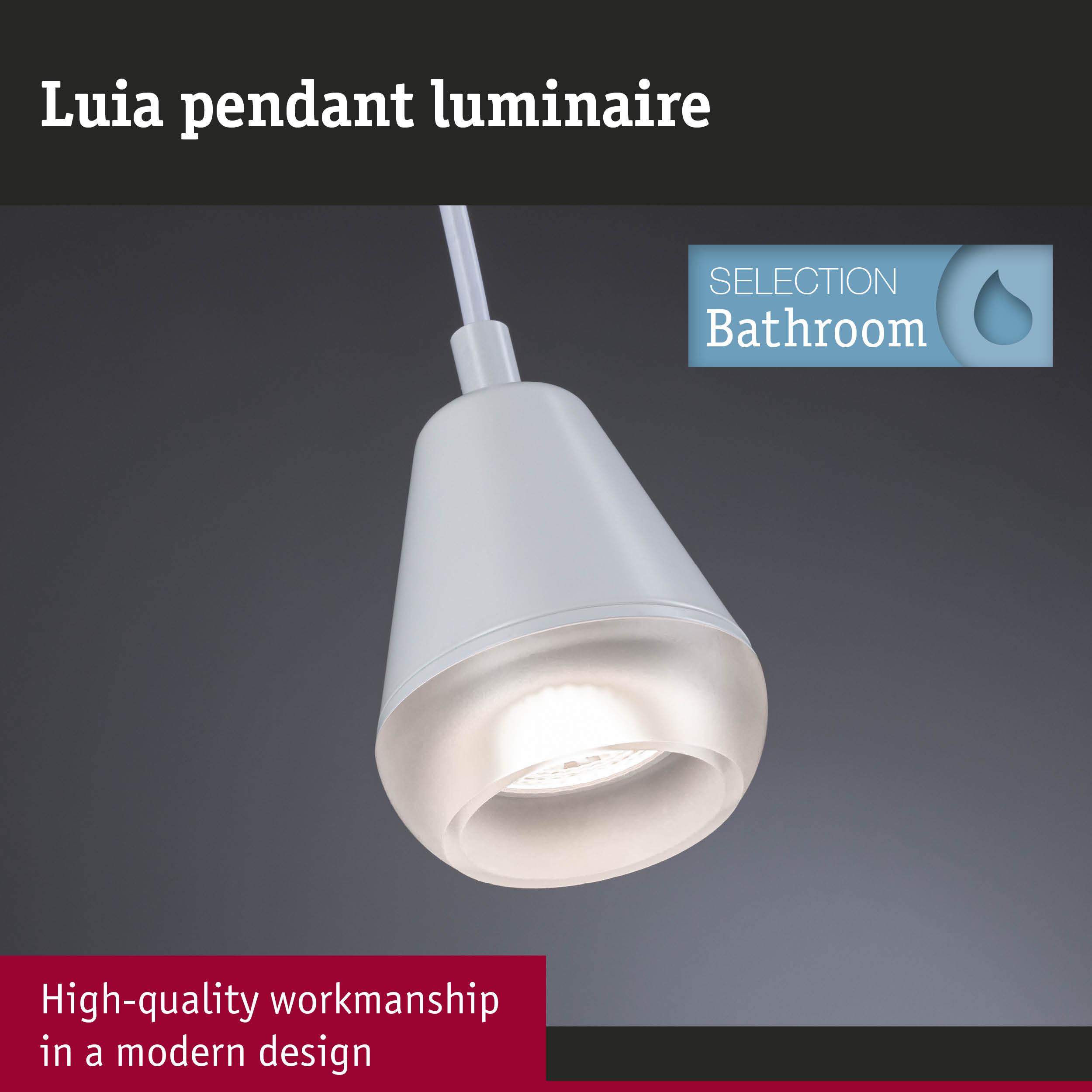 The pendant luminaire Luia in Satin/Matt white combines simple, elegant design with a technical aesthetic and is especially suited for smaller rooms. Thanks to its high-quality finish and attractive mix of plastic and metal, it has an attractive modern look. The pendant can be used in both private and commercial spaces. In the bathroom or guest toilet, IP44 certification ensures that the luminaire can be used in damp environments without a problem. In addition, the luminaire is ideal for use over dining tables or counters, where it provides subtle lighting with its reduced design. The length of the pendants is adjustable (0.7–1.50 m), allowing the luminaire to be optimally adapted to the room height. Thanks to its subtle look, the luminaire blends effortlessly into various interior styles, proving itself a real all-round talent.