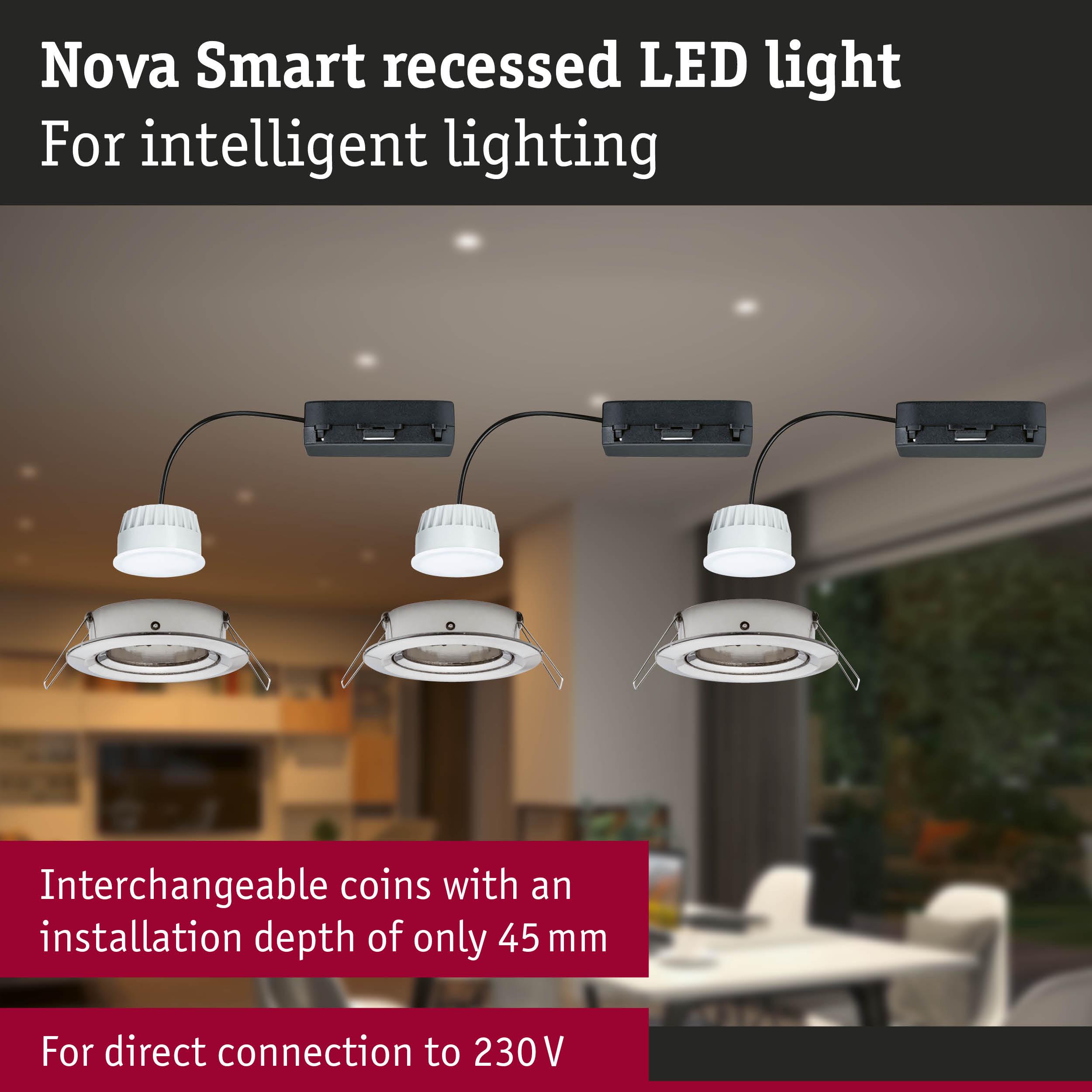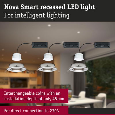 16 million colours, 16 million lighting moods – the smart Nova Coin recessed luminaire set in Brushed iron with colour-change function creates an individual living atmosphere in every room. Included in delivery are three replaceable LED lamps, including high-quality aluminium mounting rings. With an output of 3x6 watts and RGBW Zigbee 3.0 controls, the luminaires provide an efficient and innovative lighting solution. Zigbee 3.0 is a radio transmission protocol that interlinks devices from different manufacturers. The luminaires can be controlled individually or in groups via app, remote control, or voice command. From cosy, warm gold light (2200K) to functional daylight white (6500K) or colourful colour gradients: the combinations of tunable white, RGB and dimming function are virtually endless. The smart recessed luminaires can also be simply and conveniently switched on and off using a conventional light switch. When doing so, the integrated memory function stores the most recently used setting for maximum convenience. A swivel joint on the luminaire ensures that the light can be directed wherever it is needed. Installation is particularly simple and efficient thanks to the interlinkable and replaceable coins, the low installation depth of just 45mm and the 230V direct connection.