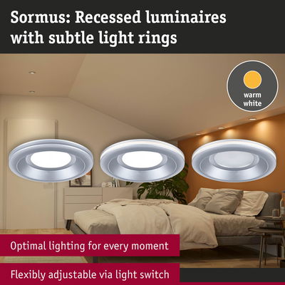 The Sormus recessed luminaire set in Chrome matt is the ideal solution for atmospheric lighting design in the bathroom, where functionality meets modern design. The IP65 protection of the luminaire makes it impervious to water jets, making it a great choice for wet room or outdoor installations. The extra large light emission ensures bright, warm white illumination at 3000 K. A particular highlight of the Sormus recessed luminaire is its flexible light control. Choose between bright illumination of your bathroom or soothing, decorative light accents. Repeated pressing of a regular light switch will activate the main light, a decorative ring light, or a combination of the two. The Sormus recessed luminaire has an installation depth of just 55 mm and can be easily installed in a shallow suspended ceiling. The practical junction box allows a direct 230 V connection and ensures easy and unlimited interlinking of the luminaires.