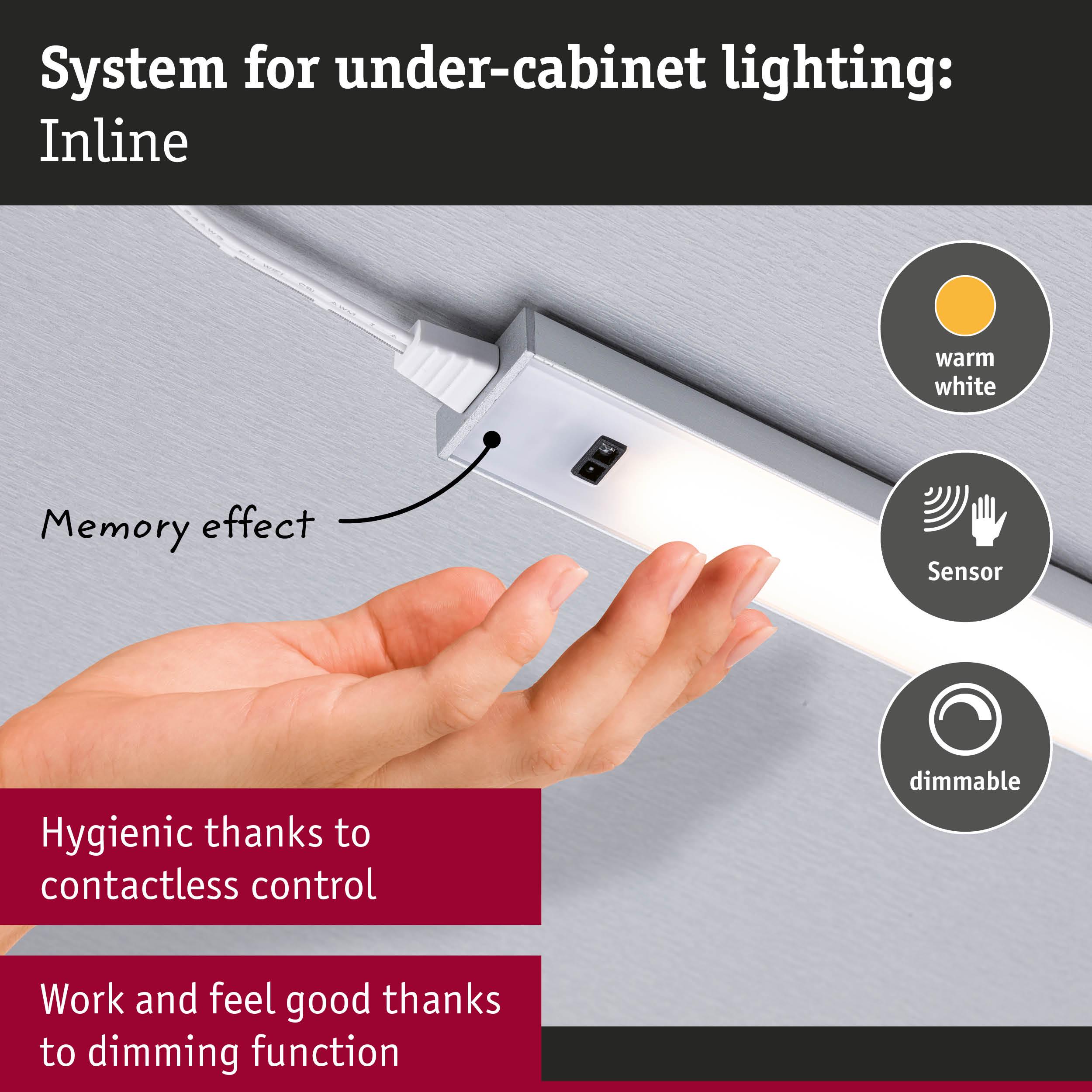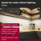 The expandable set of two Inline under-cabinet luminaires in subtle Chrome matt with a length of 550x26mm offers an elegant solution for the illumination of kitchen work surfaces. The furniture luminaires ensure optimal illumination and create a pleasant atmosphere. Thanks to their contactless controls, they enable good kitchen hygiene. The starter set can be flexibly expanded with a maximum of one expansion set When doing so, it is possible to combine different lengths to achieve the perfect lighting solution. The warm white light colour can be individually adjusted to your personal preferences using the dimming function. The luminaire is installed directly on a 230V socket with a plug-in transformer.