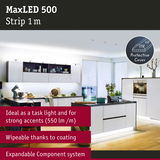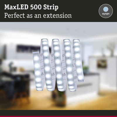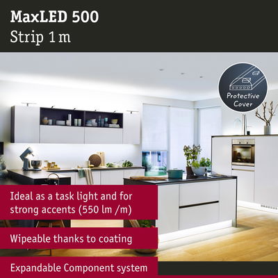 MaxLED strips are so powerful that they can easily be used as room lighting. They are real highlights especially in profiles. Warm white strips provide a cosy and relaxed room and workplace light. The basic set contain a suitable ballast in addition to the strip. Where required, it can be extended with additional strips, connectors and control units with remote control. When planning, please keep in mind the maximum length specified for the basic set, which must not be exceeded.