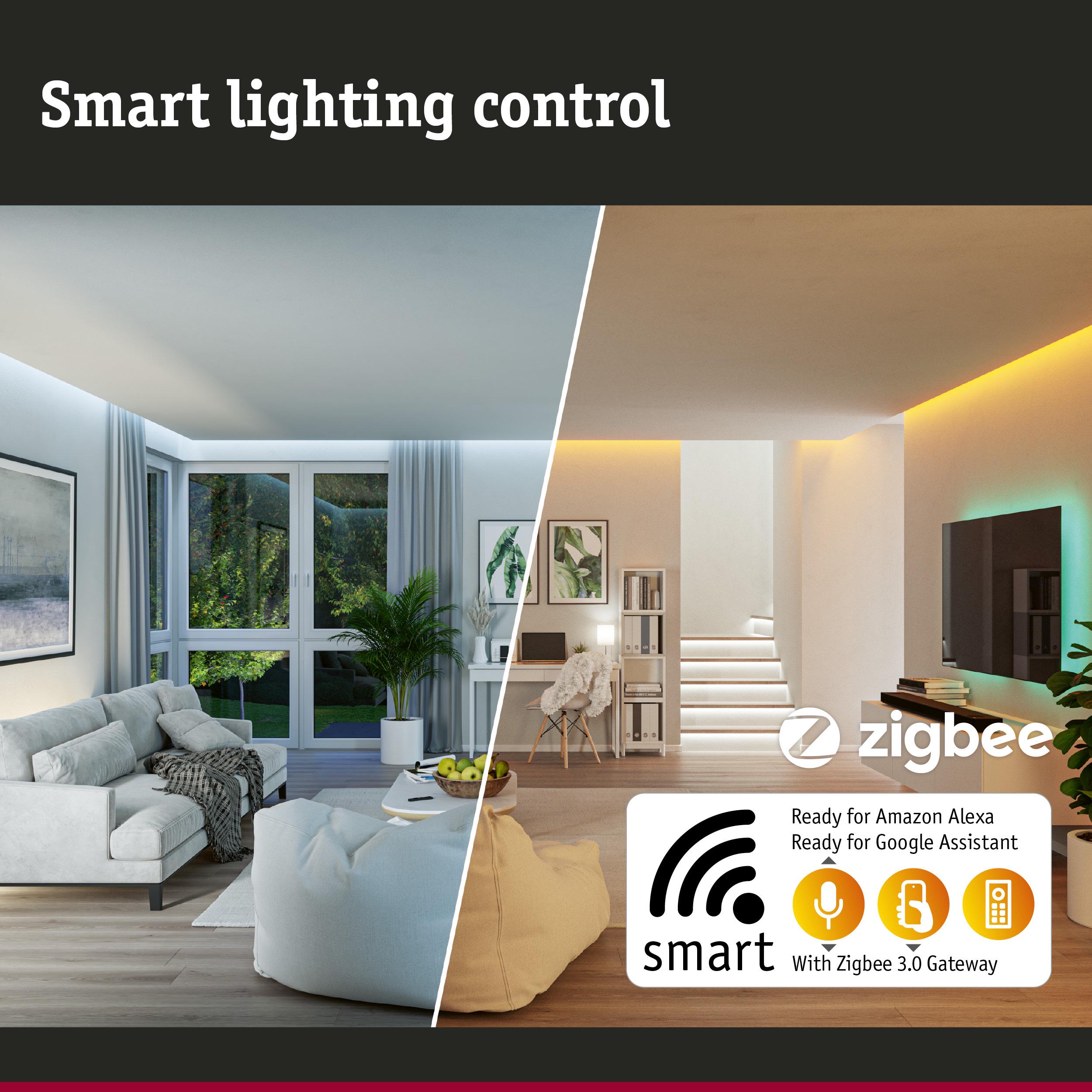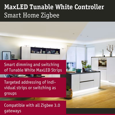 With the MaxLED tunable white controller from the Smart Home Zigbee 3.0 series, MaxLED strips with white light control can be switched and dimmed. The controller is Zigbee 3.0-compatible. Zigbee 3.0 is a radio transmission protocol which links up the devices of several manufacturers. This allows not only the centralised control of lighting; shutters, heating and alarm systems, for example, can also be integrated. To operate the control, you can choose between a gateway for the same standard by a different manufacturer, or a Smart Home Zigbee 3.0 hand-held transmitter. Specific individual components can be addressed, or switched in groups as lighting scenarios.