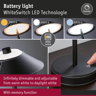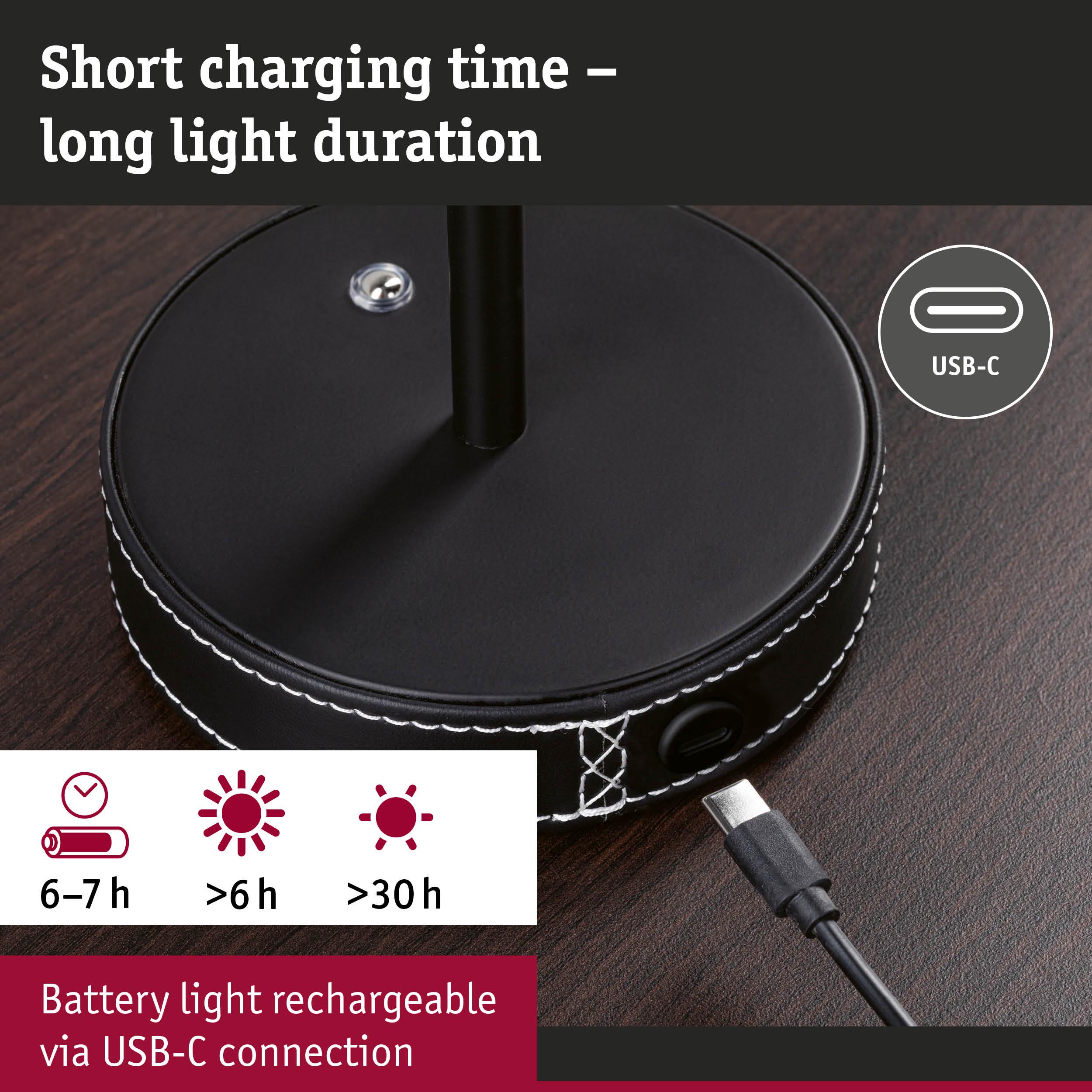 This exceptional, leather-look table luminaire with its elegant, stitched seams is not just a beautiful eye-catcher, but also very practical and versatile. In the living room, the bedroom, or in the hallway – The Pellini portable table luminaire in Black/Black matt offers atmospheric comfort lighting, while setting stylish accents with its unique look. Pellini’s upward and downward light emission creates a wonderfully warm ambience with a variety of white light colours to choose from individually via a touch switch. Additionally, the brightness is steplessly dimmable for the right mood lighting. The luminaire also features a memory function, which will set the most recently used setting when the light is switched on. The Pellini portable table luminaire features superior functionality and easy handling. Its short charging time and many operating hours mean that the luminaire is ready to use whenever you need it. The battery recharges via USB-C, making it eco-friendly and sustainable.
