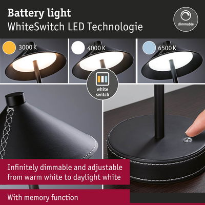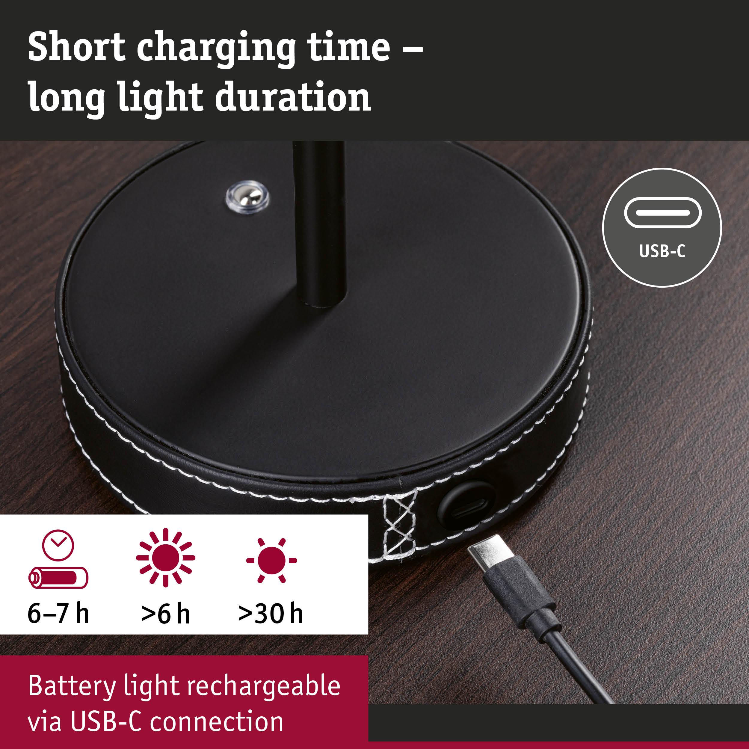 This exceptional, leather-look table luminaire with its beautifully stitched seams is not just an eye-catcher, but also very practical and versatile. In the living room, the bedroom, or in the hallway – The Pellini portable table luminaire in Black matt offers atmospheric comfort lighting, while setting stylish accents with its unique look. The touch switch makes choosing a white light colour a breeze. Additionally, the brightness is dimmable for the right mood lighting. The luminaire also features a memory function, which will set the most recently used setting when the light is switched on. The Pellini portable table luminaire features superior functionality and easy handling. Its short charging time and many operating hours mean that the luminaire is ready to use whenever you need it. The battery recharges via USB-C, making it eco-friendly and sustainable.