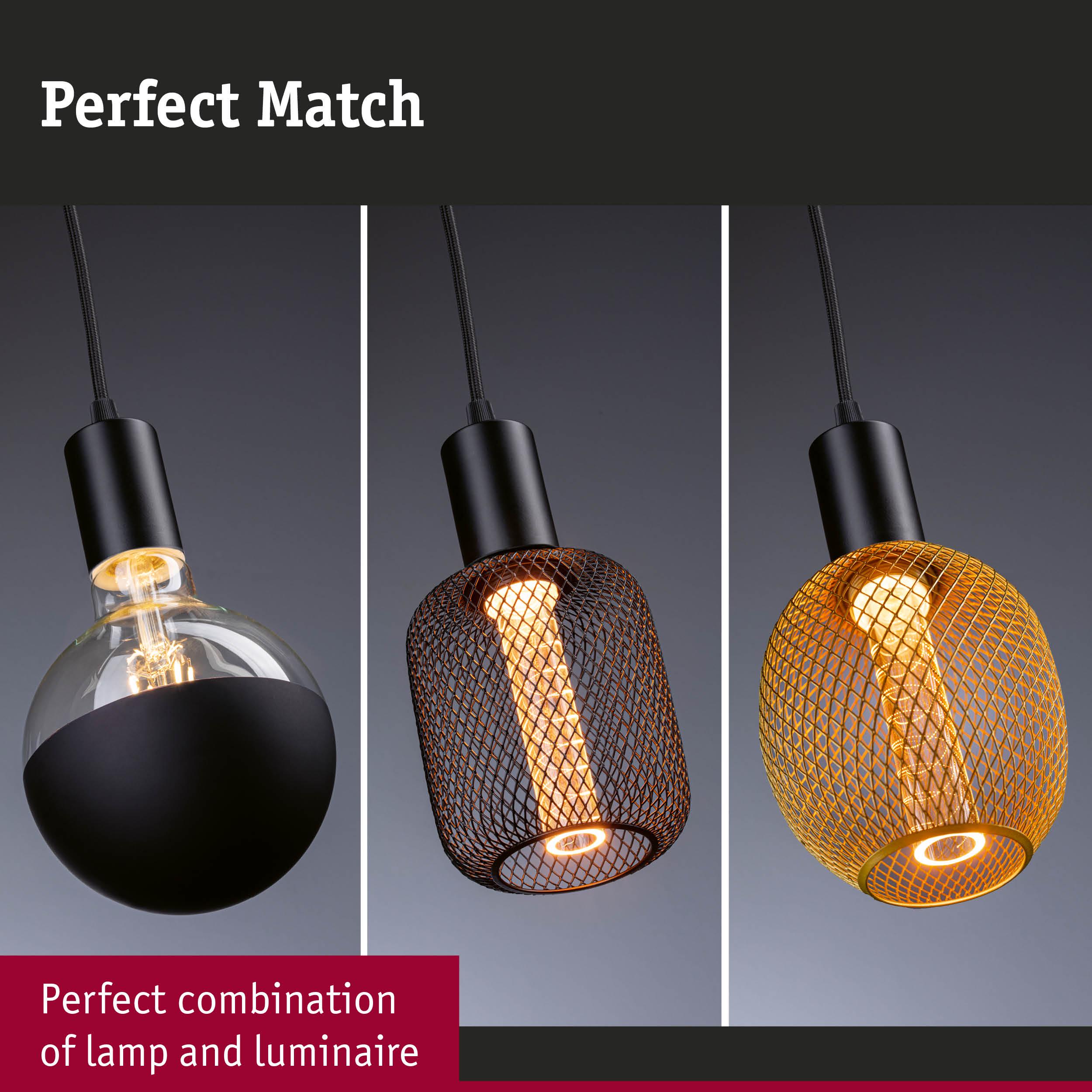 The mix & match look is absolutely on trend and allows you to beautify your home with a special eye-catcher. The modern pendant luminaire Ravi in black matt is perfect proof of this. With its minimalist, modern design and attractive colour combination, it becomes a real highlight. Thanks to its IP44 protection, the Ravi pendant luminaire can even be used in the bathroom. The affordable sets include the Metallic Glow series light source, which looks particularly harmonious in combination with the pendant luminaire. The Metallic Glow LED light source combines subtle, golden light with a decorative, brass-coloured metal basket. The luminous element at the end of the inner bulb ensures perfectly directed light downwards. Modern design meets efficient LED technology here, creating cosy and golden accent lighting.