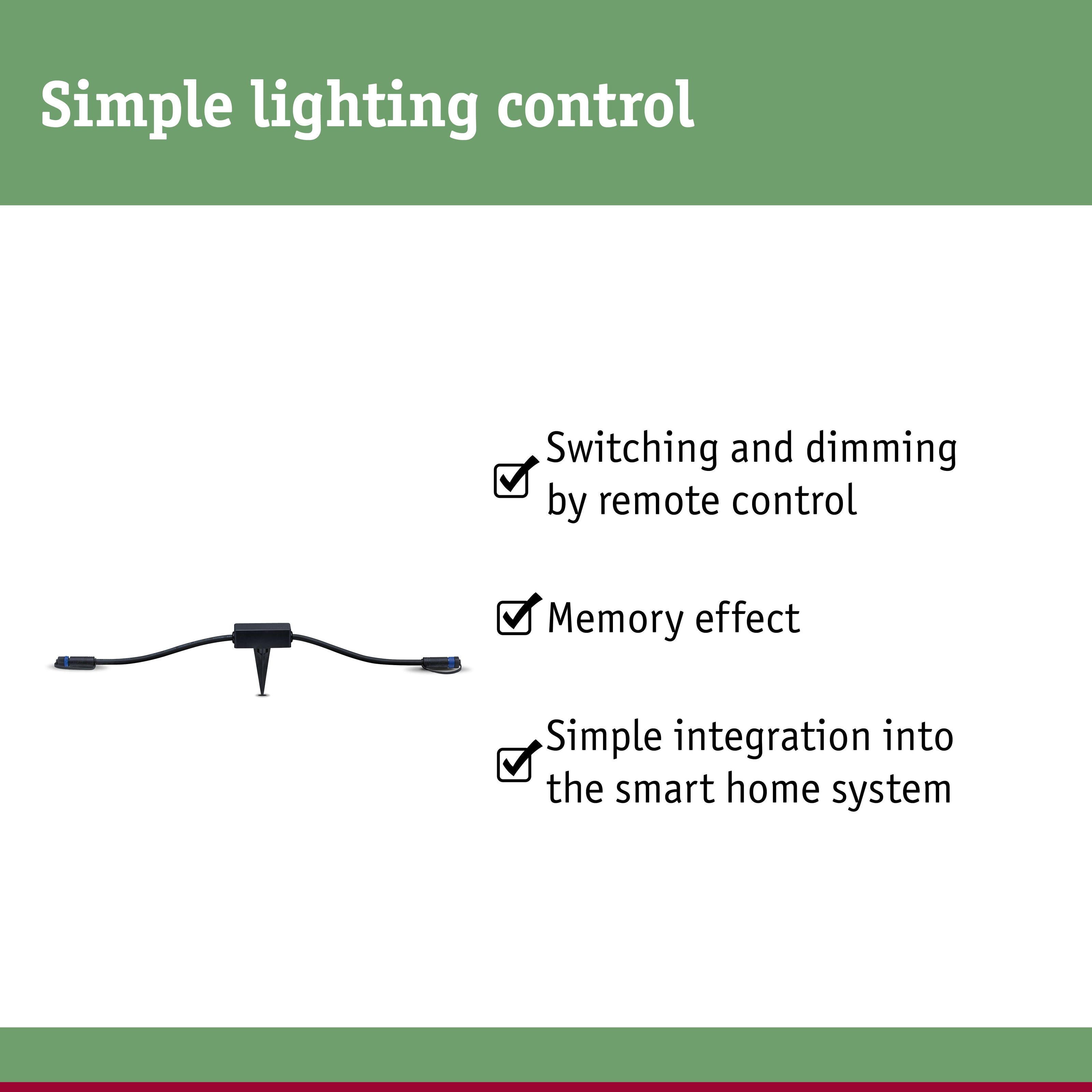 The Plug & Shine Zigbee 3.0 controller allows you to switch and dim your 24 V outdoor lighting installation. The single controller is a perfect addition to your system if you would like to control different scenarios in the garden or on the patio. The controller is Zigbee 3.0 3.0 compatible. Zigbee 3.0 is a radio transmission protocol that allows the networking of devices by multiple manufacturers.