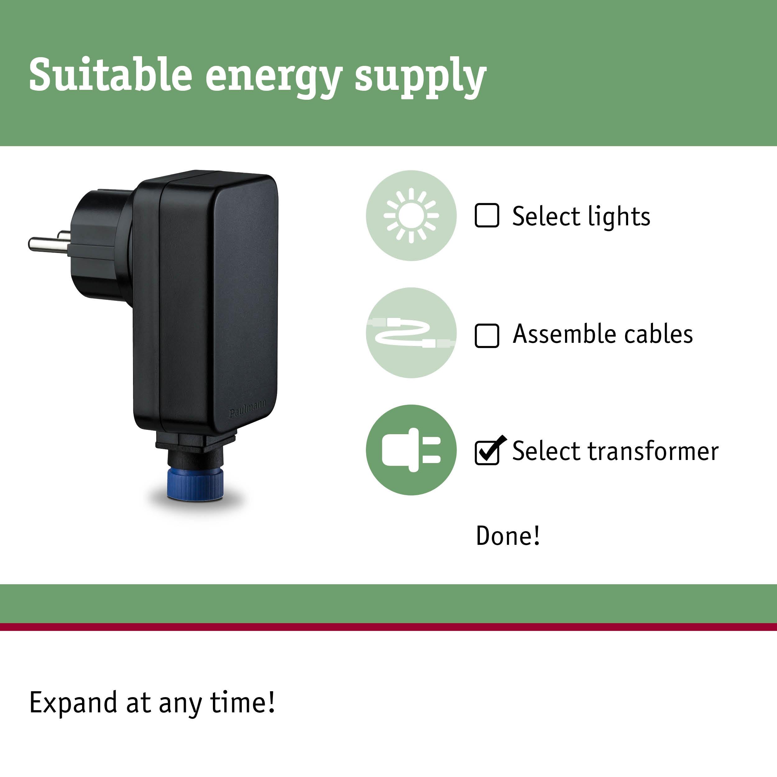 The Plug & Shine transformer with 21 watts is the ideal base for your outdoor lighting installation around the house, patio and garden. Combine different Plug & Shine luminaires and connectors any way you like, up to a maximum system length of 50 metres.