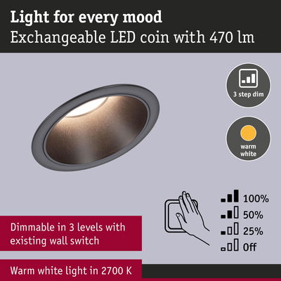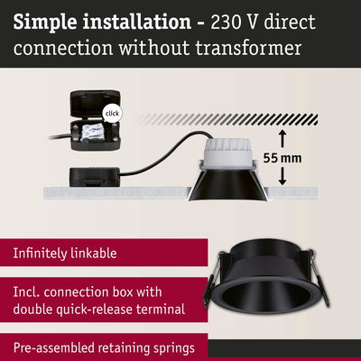 Love at second glance! The recessed luminaires Cole in matt black almost merge with the ceiling due to the recessed light source. But once you've discovered them, you won't want to look away. The high-quality recessed luminaires are offered in an attractive set of 6, which is available at a discounted price. The practical set of six warm white recessed luminaires makes an entire room shine. Thanks to the recessed coin, the lighting is soft and glare-free. With the 230V direct connection, the luminaires can be easily linked together without restriction. Thanks to the high IP protection of IP44, the recessed luminaires are also ideal for damp rooms and are protected against splashing water. They also impress with their brilliant technology: the replaceable LED coin provides pleasantly warm white light and can be dimmed in three stages using a conventional light switch. This allows the brightness to be adjusted as required – from mood lighting to full illumination.