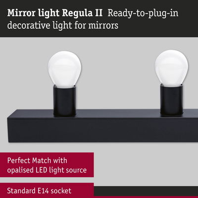 Radiantly beautiful – the ideal lighting solution for your bathroom. This practical set contains the Regula II light bar in Black/Opal, including matching opal LED lamps. The 4-lamp mirror luminaire is supplied with a practical textile cable switch, making it easy to install. All you need is a wall socket – no power outlet necessary. With its modern and clean design, it is universally suited to different interior styles and makes an eye-catching addition to either your dressing table or hallway. Its length of 60 cm is based on standard mirror dimensions. Included in delivery are four drop-shaped LED lamps in Black/Opal, which give the mirror luminaire its modern yet classic look. With an output of 4x4,5W watts each, they emit radiant, warm white light in all directions. The brightness can be adjusted as required. The Regula II is incredibly simple to install: they can be mounted above or next to the mirror on the wall. After screwing in the opal LED lamps or other lamps of your choice with an E14 fitting, it’s ready to use right away. Now there’s nothing in the way of creating a pleasant atmosphere in the bathroom. To clean the luminaires, use a soft cloth – not a microfibre cloth.