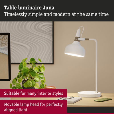 The Juna luminaire series is presented in a timeless, yet modern design language, which makes them a perfect choice for various interior styles, while creating attractive light accents in any living space. The matching table, floor and pendant luminaires in this series offer many combination options. The table luminaire in white matt with gorgeous champagne gold accents is so versatile that it can be used on the nightstand, as a desk luminaire, or as a decorative eye-catcher on the sideboard. The premium finish of this luminaire ensures an attractive look and a long service life. The flexible luminaire head allows the user to adjust the directionality of the light, while the colour-matched fabric cable further enhances its convenient and safe usage. A decorative crown mirror lamp with E14 base would be our recommendation for this luminaire to ensure glare-free light.