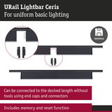 The URail light bar Ceris in Black matt, with a colour temperature of 3000K, creates a pleasant warm white lighting mood in living spaces, offices, hallways or other rooms. The wide-beam diffuser ensures glare-free and uniform light distribution. Consisting of high-quality aluminium and a simple design, it seamlessly blends into individual living concepts. Is the 32.2-cm length less than ideal? No problem – to achieve the perfect length for different rooms, any number of light bars can be connected in series. To do so, simply remove the end caps and connect the light bars using the enclosed connectors until the desired length is achieved. They can also be effortlessly connected to Zelos light bars. Another highlight is the three-step dimming function, which allows the brightness to be adjusted in three stages via a conventional light switch. For maximum convenience, the memory function stores the most recently selected setting until next activation.