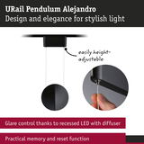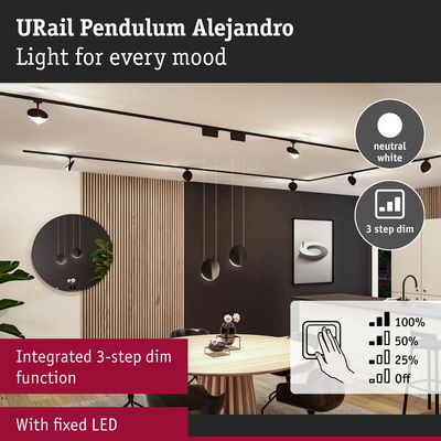 The Alejandro URail Pendant in Black matt is a feature piece for ceilings and enhances any room with its stylish design. The 3-step dimming function enables simple lighting control using an existing wall switch, with no need for an additional wall dimmer. With dimming levels of 100%, 50% and 25%, this pendant offers flexible lighting control that is suitable for any mood and every situation. The 4000 Kelvin ensures a pleasant neutral white light that provides optimal illumination for the room. The recessed LED chip with diffuser creates glare-free light with uniform distribution, for a pleasant atmosphere. The memory and reset function is so practical: you can save the last-used brightness setting or reset the settings as required. The design of the pendant adds a charming elegance to any room and creates stylish accents.