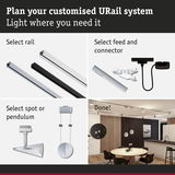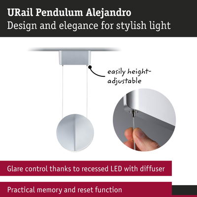 The Alejandro URail Pendant in Chrome matt is a feature piece for ceilings and enhances any room with its stylish design. The 3-step dimming function enables simple lighting control using an existing wall switch, with no need for an additional wall dimmer. With dimming levels of 100%, 50% and 25%, this pendant offers flexible lighting control that is suitable for any mood and every situation. The 4000 Kelvin ensures a pleasant neutral white light that provides optimal illumination for the room. The recessed LED chip with diffuser creates glare-free light with uniform distribution, for a pleasant atmosphere. The memory and reset function is so practical: you can save the last-used brightness setting or reset the settings as required. The design of the pendant adds a charming elegance to any room and creates stylish accents.