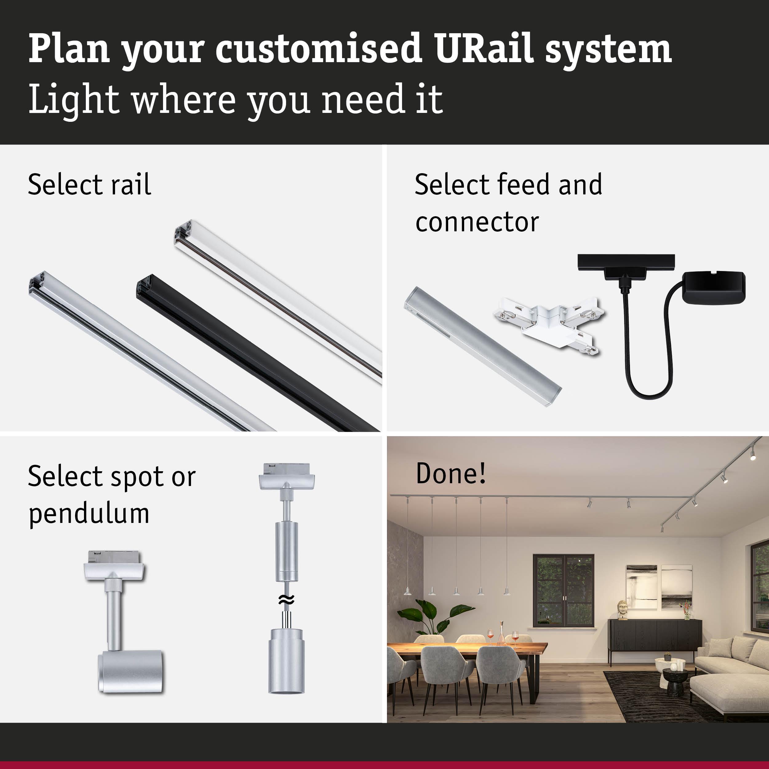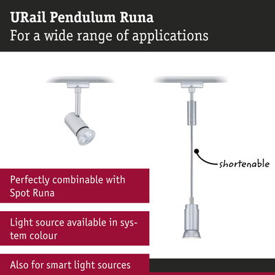 The modern Runa URail pendant in Chrome matt is characterised by its linear design. This pendant features a GU10 fitting, so that any compatible lamp can be used. When paired with a smart lamp, the pendant can be easily controlled using the app. It is also ideal for combining with the Runa spot. The fitting cover for the pendant can be moved so that lamps with bases of different lengths can fit inside. If necessary, the URail pendant can be shortened. Detailed step-by-step instructions can be found in the FAQs in the Support Centre.