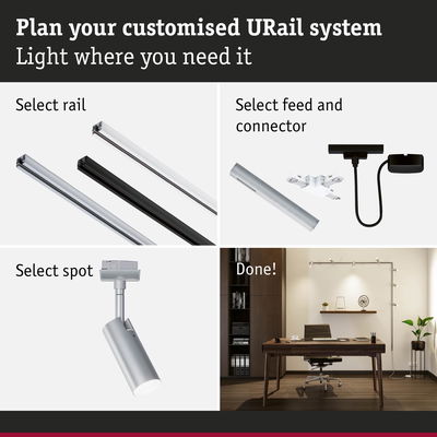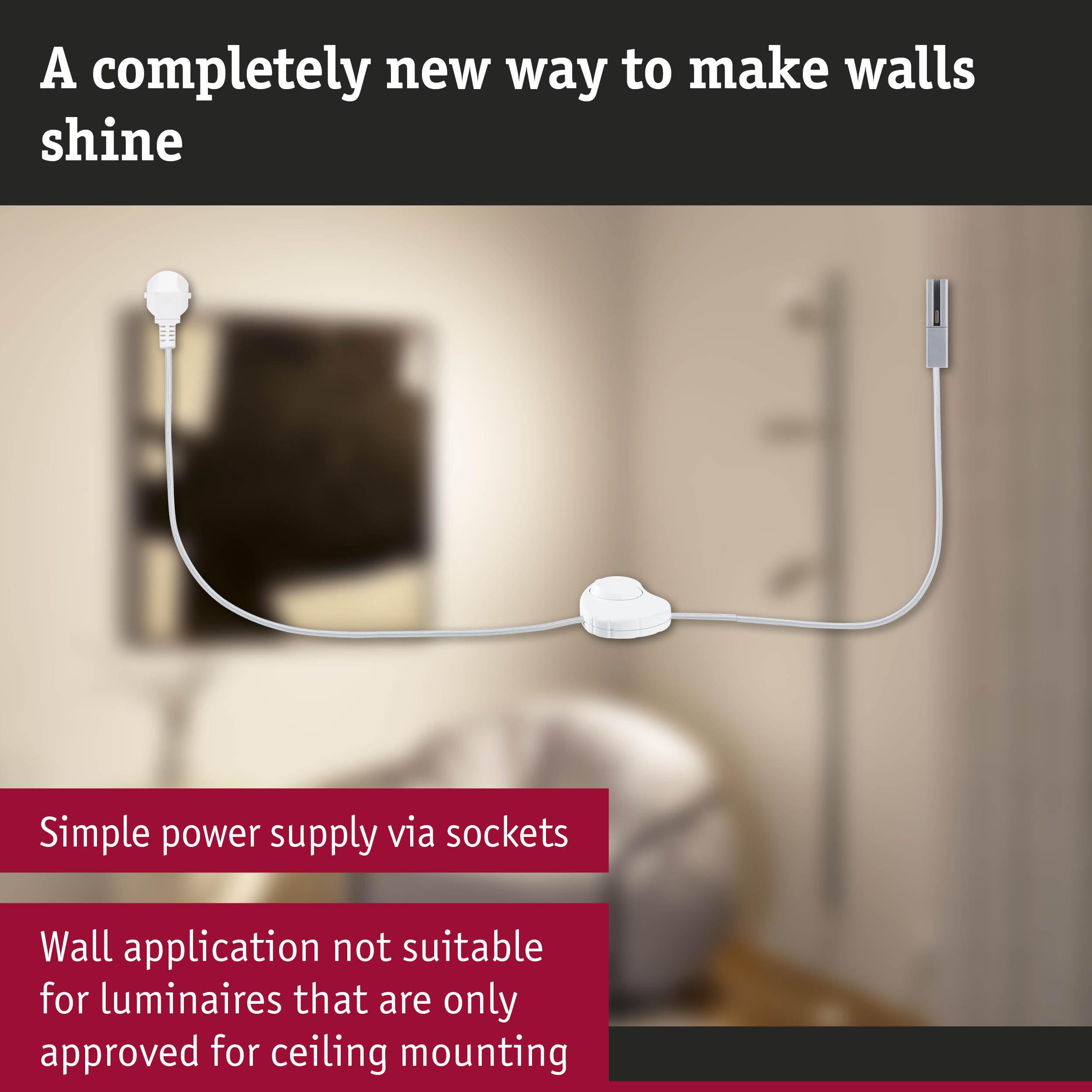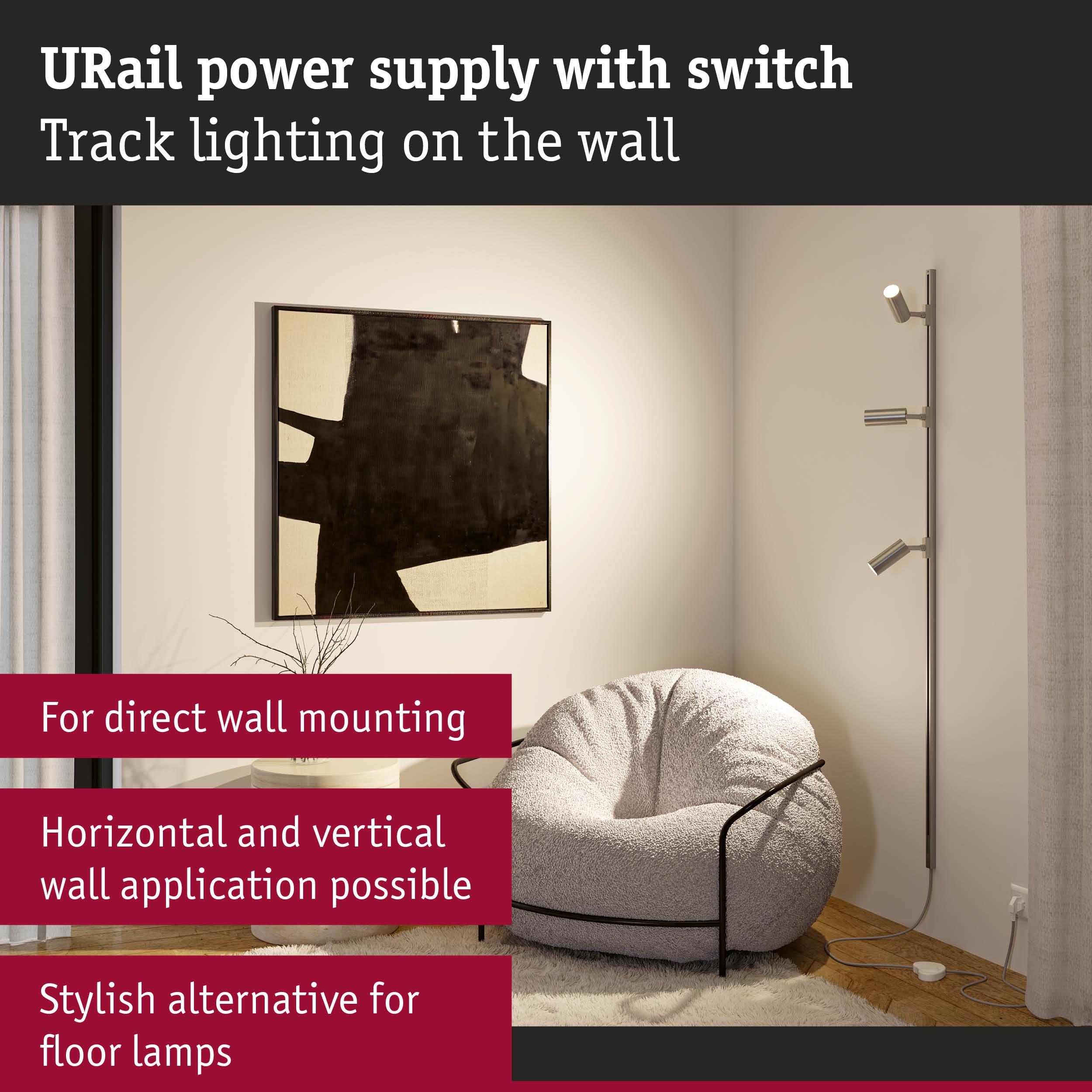 The URail infeed with switch in Chrome matt creates a new way of lighting your walls. The URail system can be installed either on the wall or on the ceiling. This solution offers optimal room illumination and is also easy to install. The minimalist design of the rail system blends seamlessly into any surroundings. The cable infeed has a Europlug, cable and cable switch, so the luminaires can be mounted on the wall using floor-level sockets. Both horizontal and vertical wall applications are possible. Perfect for living room, study or bedroom, the URail feed with switch offers the ideal solution for atmospheric lighting. The power cable extends 210cm from the plug to the switch and 30cm from the switch to the rail