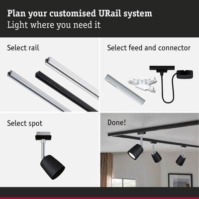 With the practical URail starter set, nothing stands in the way of the perfect lighting installation. This set is not only available at a discounted price, it also includes all of the essential components required for the installation of a new URail system. A special highlight of the set is the three black matt URail Spot Cover, which offer full flexibility when selecting the light source. Any reflector lamp with a GU10 socket with a maximum output of 10W can be selected - whether for white or coloured light, with a focused beam or a broad beam. The discreet design of the spot matches any interior style and opens up a wide range of possible applications. The included URail middle feed in black matt has the same form as the track and blends perfectly into any lighting installation. Another important component in the URail starter set is the internal line connector, which is invisable as it disappears into the track when assembled. Together with the 1m URail track in matching black matt, the attractive set offer is complete.