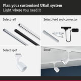 With the practical URail starter set, nothing stands in the way of the perfect lighting installation. This set is not only available at a discounted price, it also includes all of the essential components required for the installation of a new URail system. A special highlight of the set is the three signal white URail Spot Cover, which offer full flexibility when selecting the light source. Any reflector lamp with a GU10 socket with a maximum output of 10W can be selected - whether for white or coloured light, with a focused beam or a broad beam. The discreet design of the spot matches any interior style and opens up a wide range of possible applications. The included URail middle feed in signal white has the same form as the track and blends perfectly into any lighting installation. Another important component in the URail starter set is the internal line connector, which is invisable as it disappears into the track when assembled. Together with the 1m URail track in matching black matt, the attractive set offer is complete.